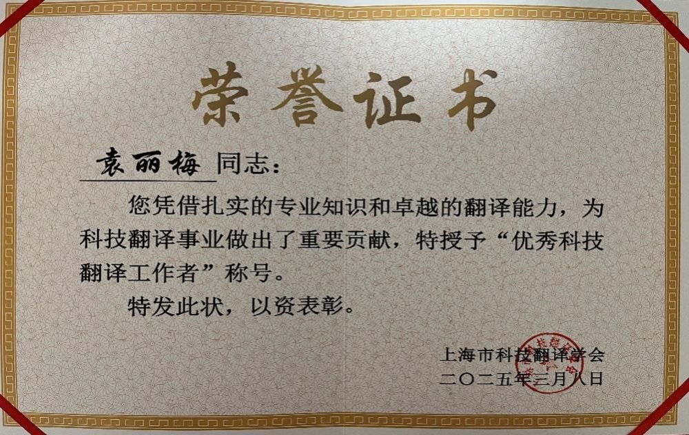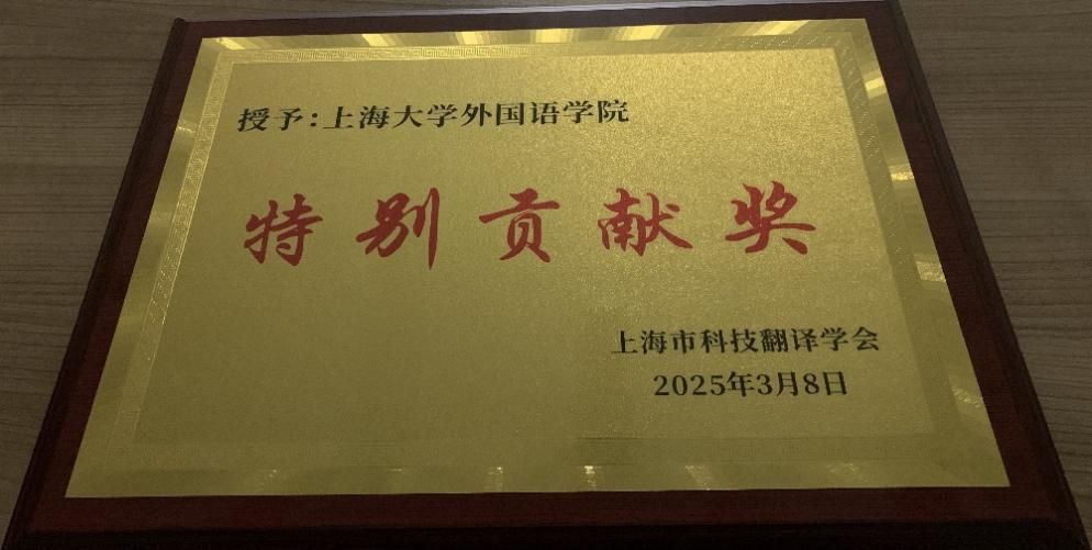 2025年3月8日,由上海市科技翻译学会主办、上海理工大学外语学院承办的“上海市科技翻译学会2024年年会暨成立40周年庆祝大会”上,我校澳门正规电子游戏平台荣获上海市科技翻译协会颁发的“特别贡献奖”,袁丽梅副教授荣获“优秀科技翻译工作者”称号。