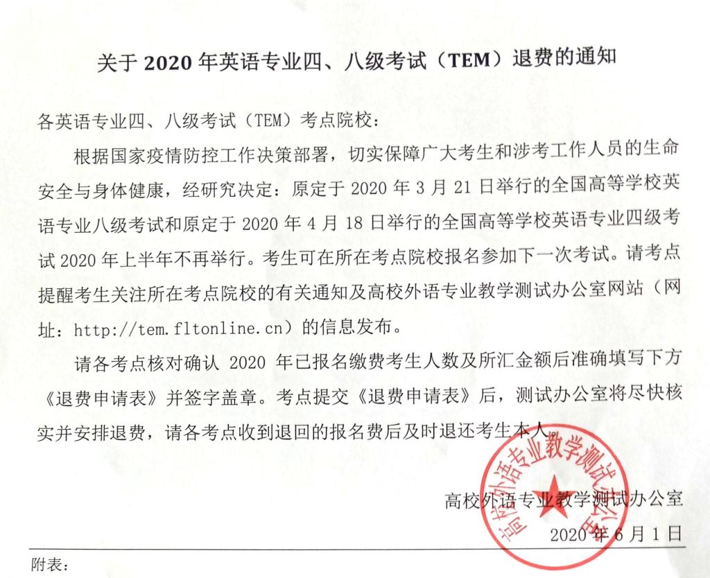 接英语专四专八考点通知,2020年的测试正式取消,学院正在安排退还报名费事宜。毕业离校的考生务请不要注销那张绑定学号缴学费用的银行卡,缴纳的报名费将直接退入银行卡内。如2021年举办专四专八测试,退费的考生将有资格允许随下届考生续报名一次。