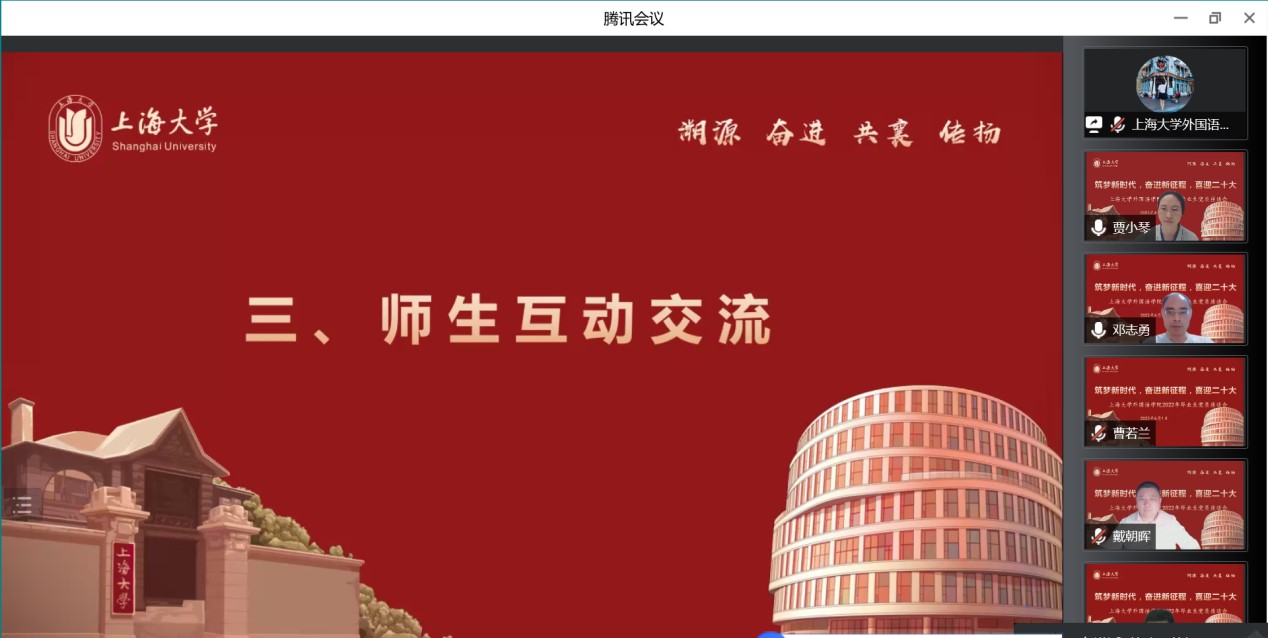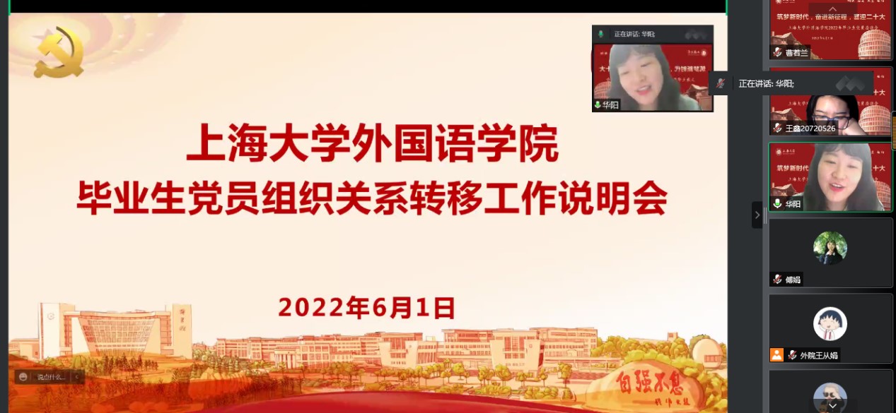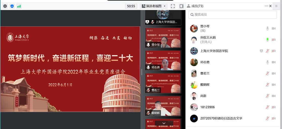 2022年6月1日晚,澳门正规电子游戏平台以“筑梦新时代,奋进新征程,喜迎二十大” 为主题的2022年毕业生党员教育活动顺利开展。澳门正规电子游戏平台党委书记邓志勇、院长尚新、副院长戴朝晖、英语党总支书记张建琴、行政党支部书记郑醒芝、英语系第二党支部书记于梅欣、英语系第三党支部书记马拯、党委组织员华阳、团委书记马思涵、研究生辅导员曹若兰、学生第一党支部书记王从娟以及2022届本研毕业生党员参加了本次活动。本次活动由澳门正规电子游戏平台党委副书记、副院长贾小琴主持。
