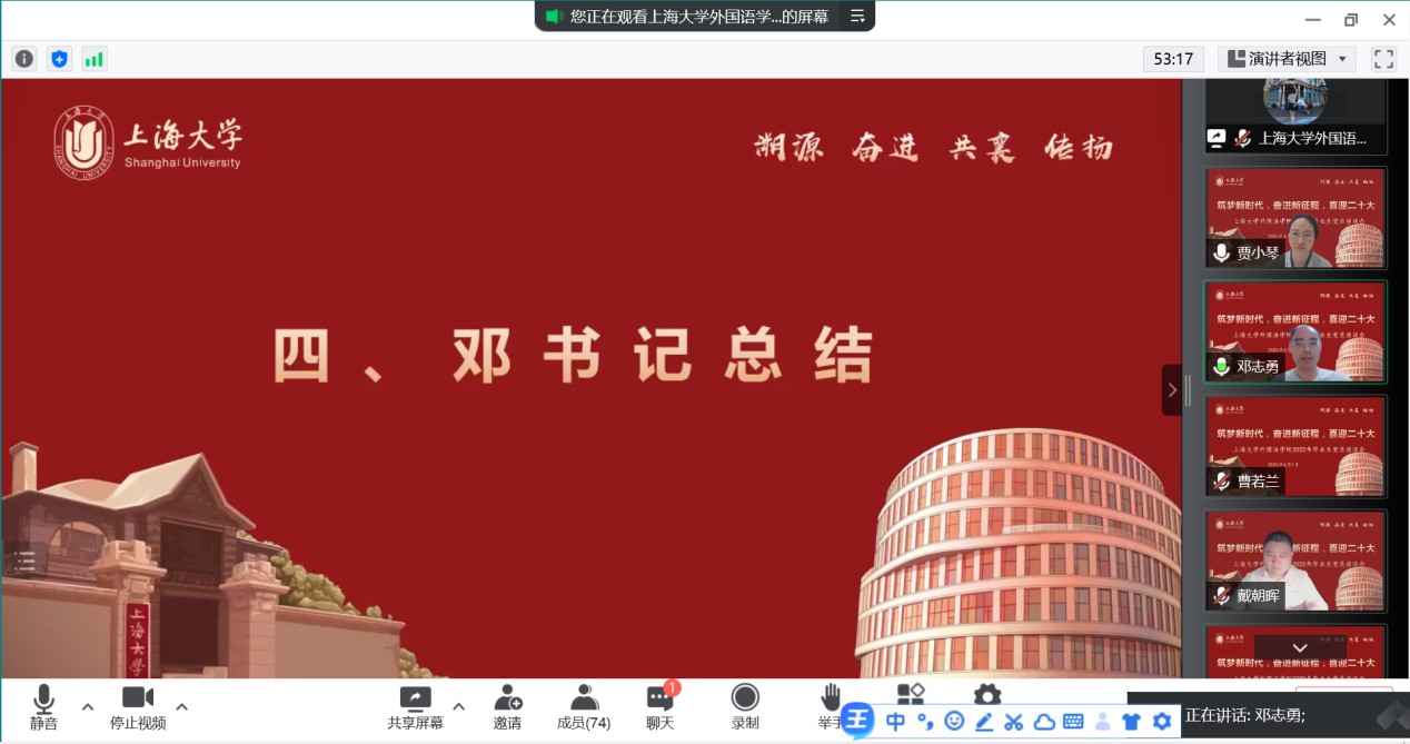 最后,邓志勇书记作总结发言,表示无论毕业生党员们今后步入工作岗位还是继续深造学习,要不断提升自己的理论水平,提高明辨是非能力;要学习党的历史,学习中华民族的发展历史,从历史的发展进程中吸取智慧,增强我们的力量,学以致用,促进中外文化交流,彰显新时代青年党员担当,积极发挥党员先进性和先锋模范作用,努力回报社会,回报母校。