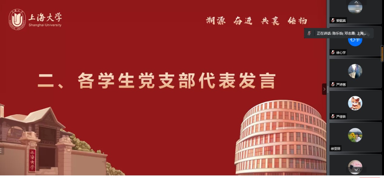 随后,毕业生党员代表们回顾了大学四年学习和成长的历程,表达了对学校和学院的感激之情。2019级学术型研究生党支部组织委员陈乐怡讲到,经过三年的研究生生涯,我们一路求索,在党支部这个集体中一步一步成长;在今后,我们应该做一个有规划、有勇气、努力向前的人,发挥党员的先锋模范作用,牢记上大校训,以严谨的态度和专业的精神辛勤工作,不断向前,为社会做出一份贡献。2020级专业型第一党支部书记严程极表示,支部党员在校期间参加了校运动会、上海电影节、上海自然博物馆等多种志愿者活动,始终践行全心全意为人民服务的宗旨,值得一提的是,本次疫情期间更是积极参与校园防疫,相信未来大家会继续发扬上大的“红色学府”精神。2020级专业型研究生第二党支部书记王鑫表示,今后会始终以优秀党员的标准严格要求自我,努力学习,扎实工作,争取在未来的工作中取得更大的成绩,不辜负母校的培养,不辜负老师的教诲,发扬上大外院“开放包容进取”的精神,做社会的栋梁,为上大外院争光。学生第一党支部书记党员张姝雯讲到,自己和同学们度过了充实的大学校园生活,感恩这四年大学生活给予的锻炼和馈赠,并表明自己今后会在不同的集体里继续发挥党员作用。