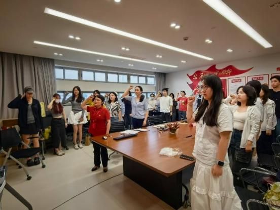 吴蔚书记在总结讲话中提到毕业生党员践行“三个务必”:不忘初心、艰苦奋斗、敢于斗争,强调外语专业学生要立足文明互鉴,在对外交流中做到不卑不亢,把求知报国作为终身事业,像向日葵一样永远向阳生长。最后,她带领全体党员重温入党誓词,庄重肃穆的宣誓仪式将座谈会推向高潮。