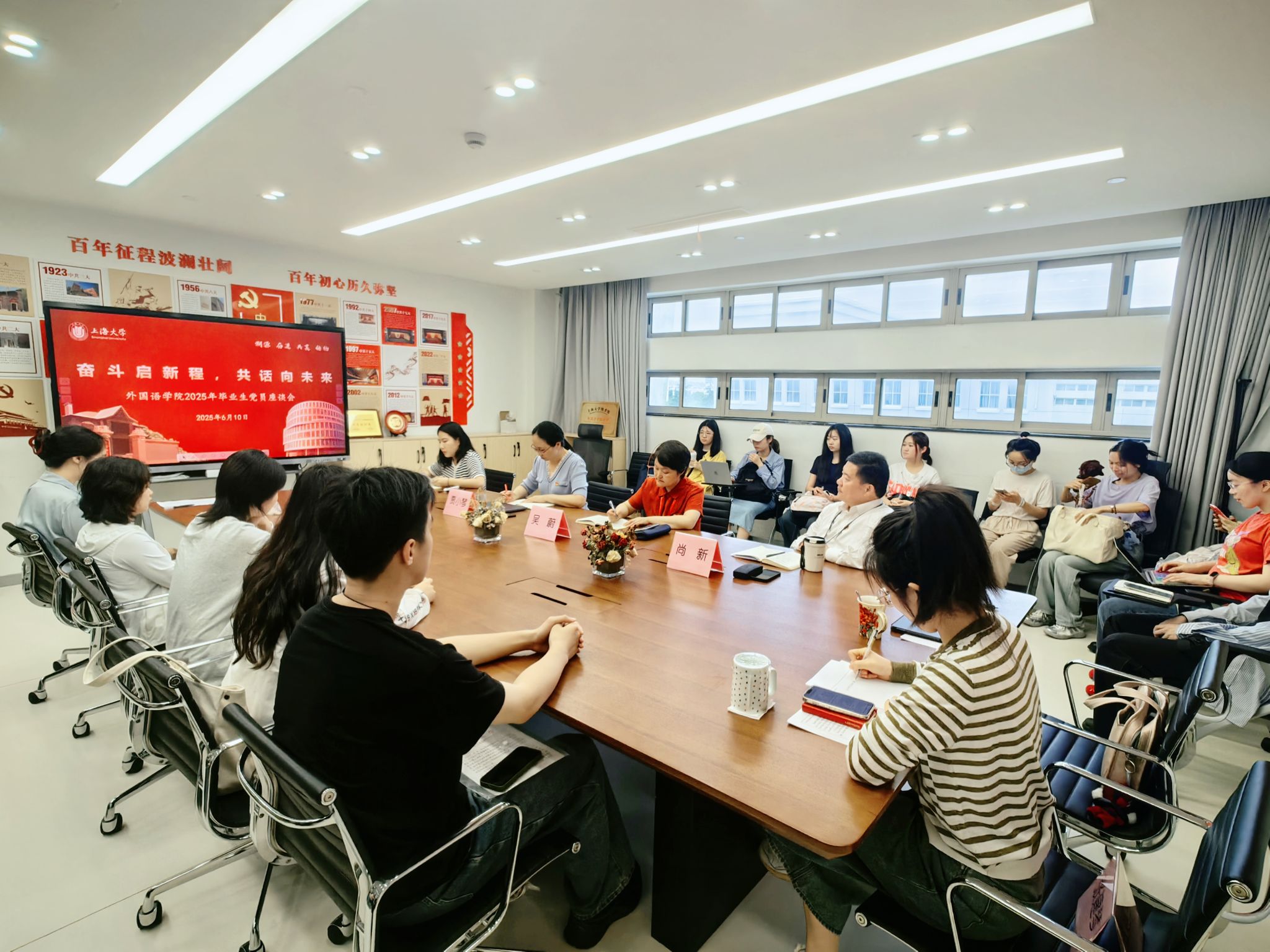 座谈会伊始,尚新院长对毕业生提出三点期望。他强调,作为党员毕业生,首先要牢记初心使命,始终以党员标准严格要求自己;其次要充分发挥专业特长,以创新视野为构建人类命运共同体贡献力量;最后要做有温度的奋斗者,将人文关怀融入工作实践。尚院长特别引用陈望道翻译《共产党宣言》时"真理的味道非常甜"的典故,勉励毕业生们坚定理想信念,成长为具有"中国灵魂、国际视野"的卓越创新外语人才。