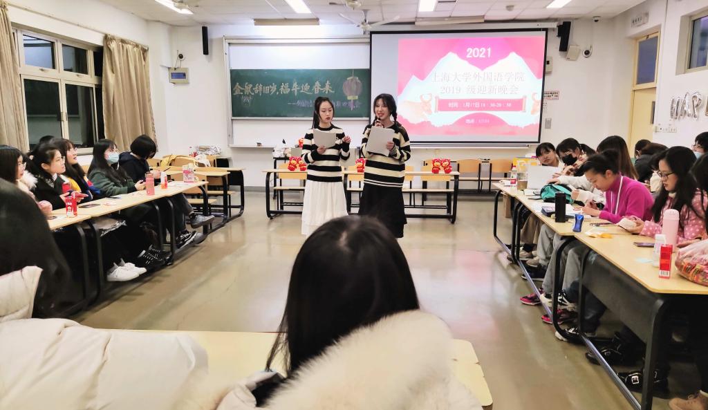 1月17日18:30,澳门正规电子游戏平台2019级“金鼠辞旧岁,福牛迎春来” 迎新联欢晚会在宝山校区AJ104顺利举行。辅导员梁苗和全体2019级学生共同参加了本次晚会。晚会由英语系曹怡雯和李杨文朔两位同学主持。晚会共有四个部分,分别是游戏环节、节目表演、抽奖环节及集体生日会。