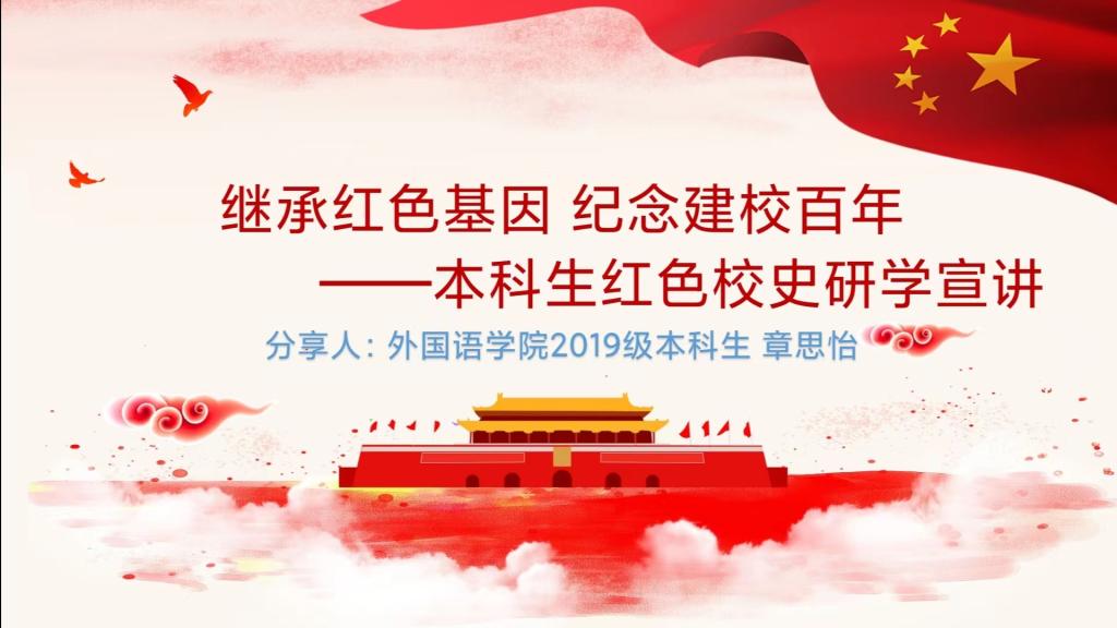 5月14日下午,澳门正规电子游戏平台红色宣讲团成员,外语学院19级本科生章思怡同学为学院本科生带来了一场生动有趣的红色校史研学宣讲,主题为“继承红色基因、纪念建校百年”。