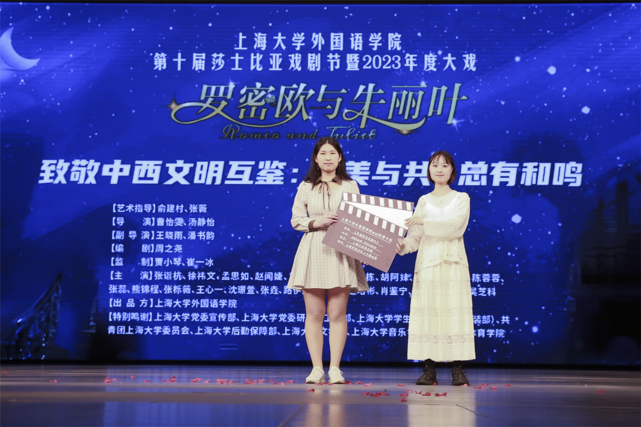 尾声,学院大戏演出团队完成了年度交接仪式。满怀着深情与希冀,本次《罗密欧与朱丽叶》的总导演曹怡雯同学将大戏的交接棒传递给莎翁剧社现任社长沈相同学,寓意外院大戏优秀传统不断延续、莎翁经典永远流传。