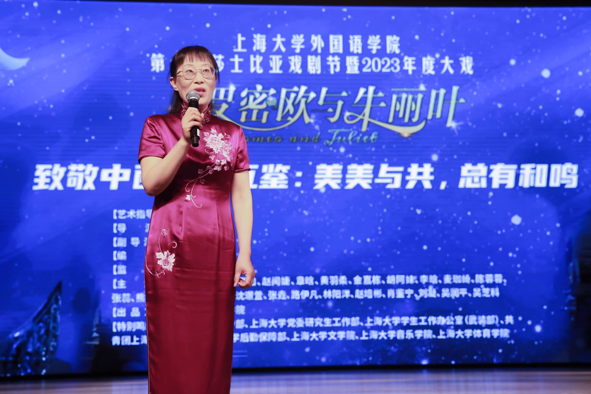 演出结束后,本剧指导老师张薇老师上台对大戏的演出进行精彩的点评。张老师充分肯定了全剧组演职人员为大戏所付出的努力,并对大戏作品中的街斗戏、殉情戏和阳台戏等演绎表示由衷地欣赏,并高度赞扬了主演与配角将其所饰的角色特质演绎得细致入微、淋漓尽致。随后,俞建村老师以视频的形式致敬莎士比亚,解析《罗密欧与朱丽叶》这出经典爱情悲喜剧中人物的爱恨情仇。短暂的相遇带来刻骨铭心的爱恋,戏中主角甚至不惜为爱殉情,莎士比亚戏剧演绎人生百态,使现场的师生观众能够更好地体验语言的魅力。