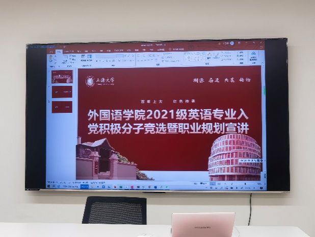 9月22日下午,澳门正规电子游戏平台2021级英语班入党积极分子竞选活动在宝山校区C104顺利开展。学院党委副书记副院长贾小琴,本科生辅导员王从娟,2021级英语班全体同学参加了此次班会。