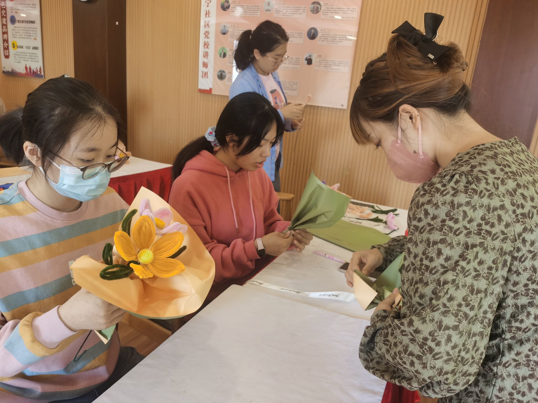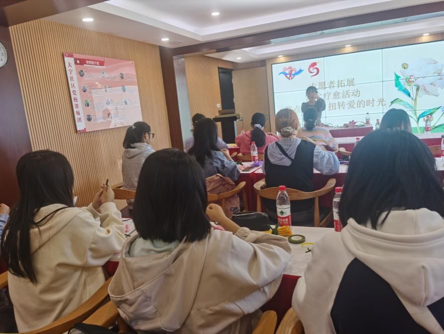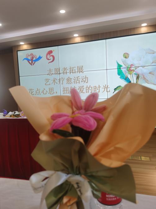 接下来,志愿者们一起进行了手工尝试——艺术疗愈 “花点心思,扭转爱的时光”。手工老师耐心仔细地教大家如何用扭扭棒做成一束花以及花朵的包装艺术。一缕阳光义工队的成员们在老师帮助下细心地进行手工编织,完成手工花的制作并合影留念。
