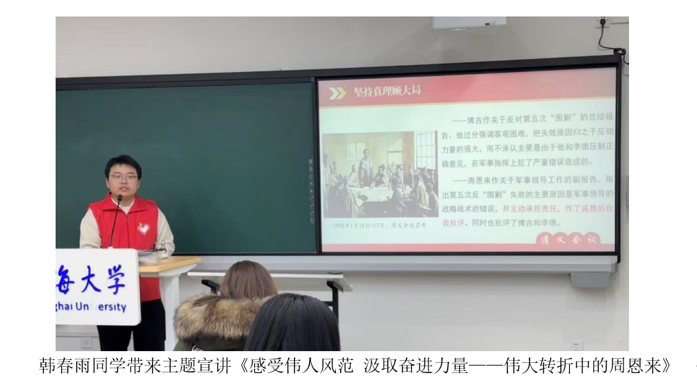 马克思主义学院“沪与遵行”遵义会议精神志愿宣讲团成员韩春雨带来主题宣讲《感受伟人风范 汲取奋进力量——伟大转折中的周恩来》。韩春雨以周恩来总理在遵义会议期间的关键作用为线索,生动再现了那段波澜壮阔的历史。他详细讲述了周恩来总理在会议前精准洞察敌情、提出战略建议,为会议召开奠定基础;会议中以卓越政治智慧和军事才能,助力纠正错误军事路线,确立正确战略方针;会后坚决执行会议精神,指挥红军灵活机动、突破重围,成功实现战略转移。韩春雨还分享了周恩来总理在艰苦岁月里,始终坚守初心、严于律己、关心同志的感人事迹,让在场师生深刻感受到伟人风范,汲取到奋进力量,激励大家传承红色基因,弘扬革命精神,为实现中华民族伟大复兴不懈奋斗。