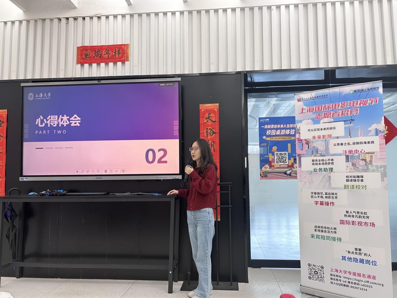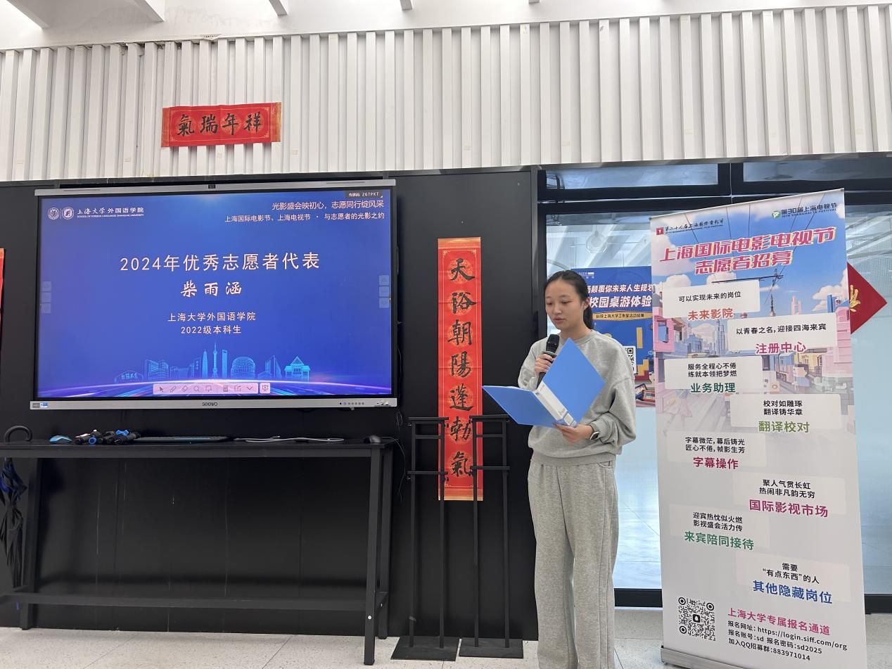 随后,2024年优秀志愿者代表——澳门正规电子游戏平台研究生汤静怡与本科生柴雨涵进行分享。汤静怡以切身体验讲述自己的真实志愿经历,她与上海电影节和电视节的三次结缘;柴雨涵则用“字幕机”的视角,揭秘字幕制作背后的技术细节与团队协作故事。两位志愿者的生动讲述,让现场掌声不断,也让台下志愿者们更加坚定了参加“两节”志愿服务的决心。
