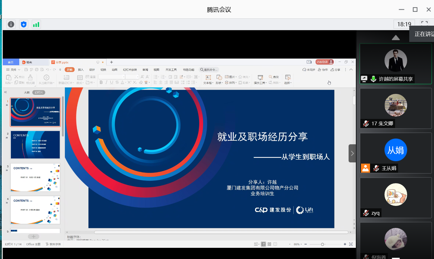 2020年刚刚就职于建发(上海)有限公司的许越校友以“就业及职场经历分享——从学生到职场人”为主题为大家进行了分享。他首先说明,本次线上与大家见面是因为目前在厦门建发集团有限公司物产分公司出差,希望以后有机会再跟学弟学妹线下交流。接着,他向大家介绍了春招及秋招的基本内容,提到秋招相对于春招试题难度更大,但秋招机会多、且为全国统招,其形式、流程均相对规范,提醒大家重视。随后,许越校友分享了自己毕业至今的求职过程、职场经历以及工作经验,建议学弟学妹们在选择职业时不要受专业的限制,要结合兴趣和特长,简历力求简洁明了,凸显自我优势但避免冗长。此外,他还推荐了一些招聘渠道,例如官方微信公众号、校园及企业官网等。