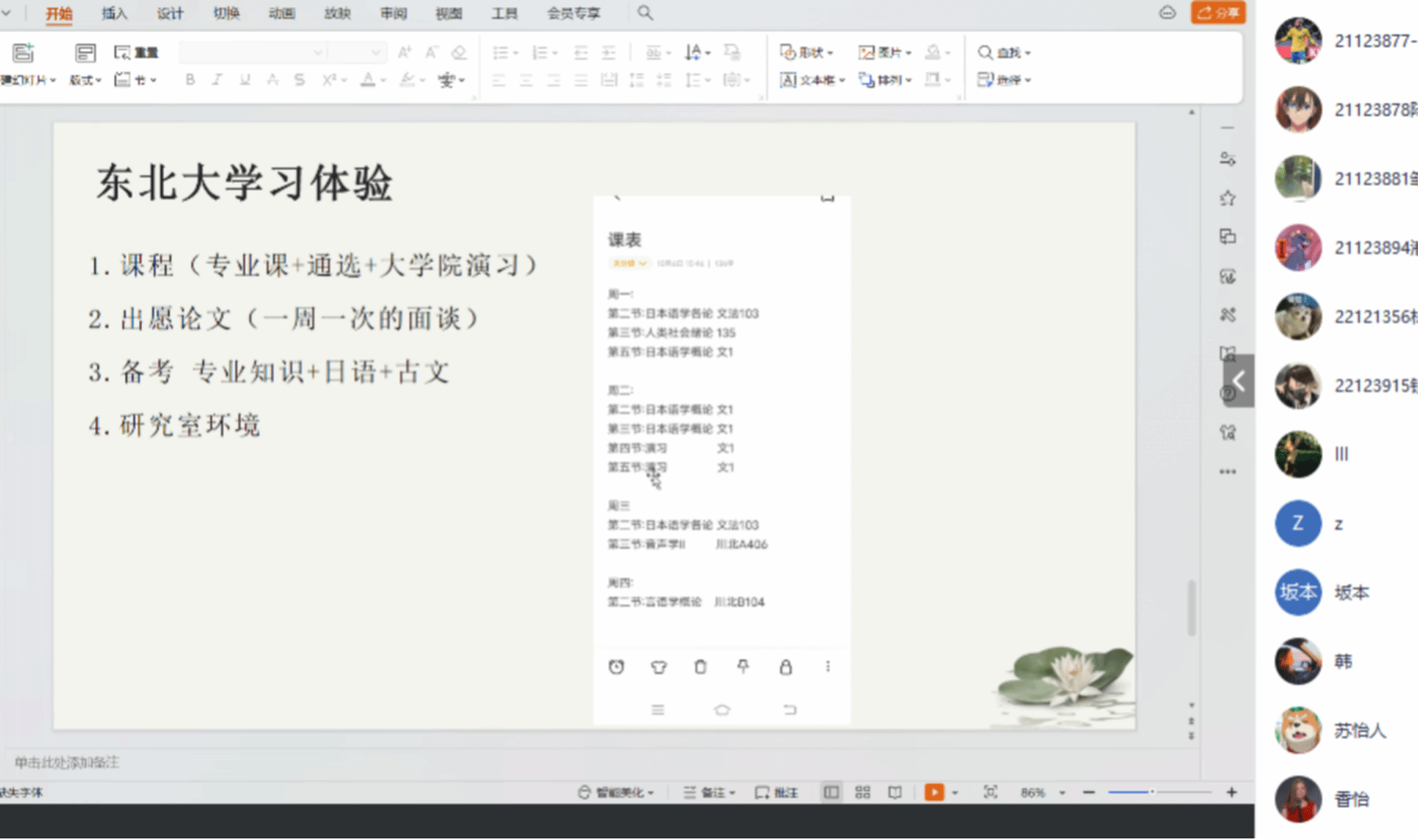 随后,周禧龙校友分享了其申请攻读日本东北大学日本语学方向硕士研究生的心路历程。与苏怡人校友的直考升学路径有所不同,周禧龙同学介绍了其从“旁听生”到“硕士研究生”路径的求学体验。在分享过程中,重点对于作为旁听生在东北大学学习的详细情况进行了介绍。尤其针对课程安排,与导师的互动方式,研究室的环境等,面向有相似生涯规划的在校生进行了细致的讲解。