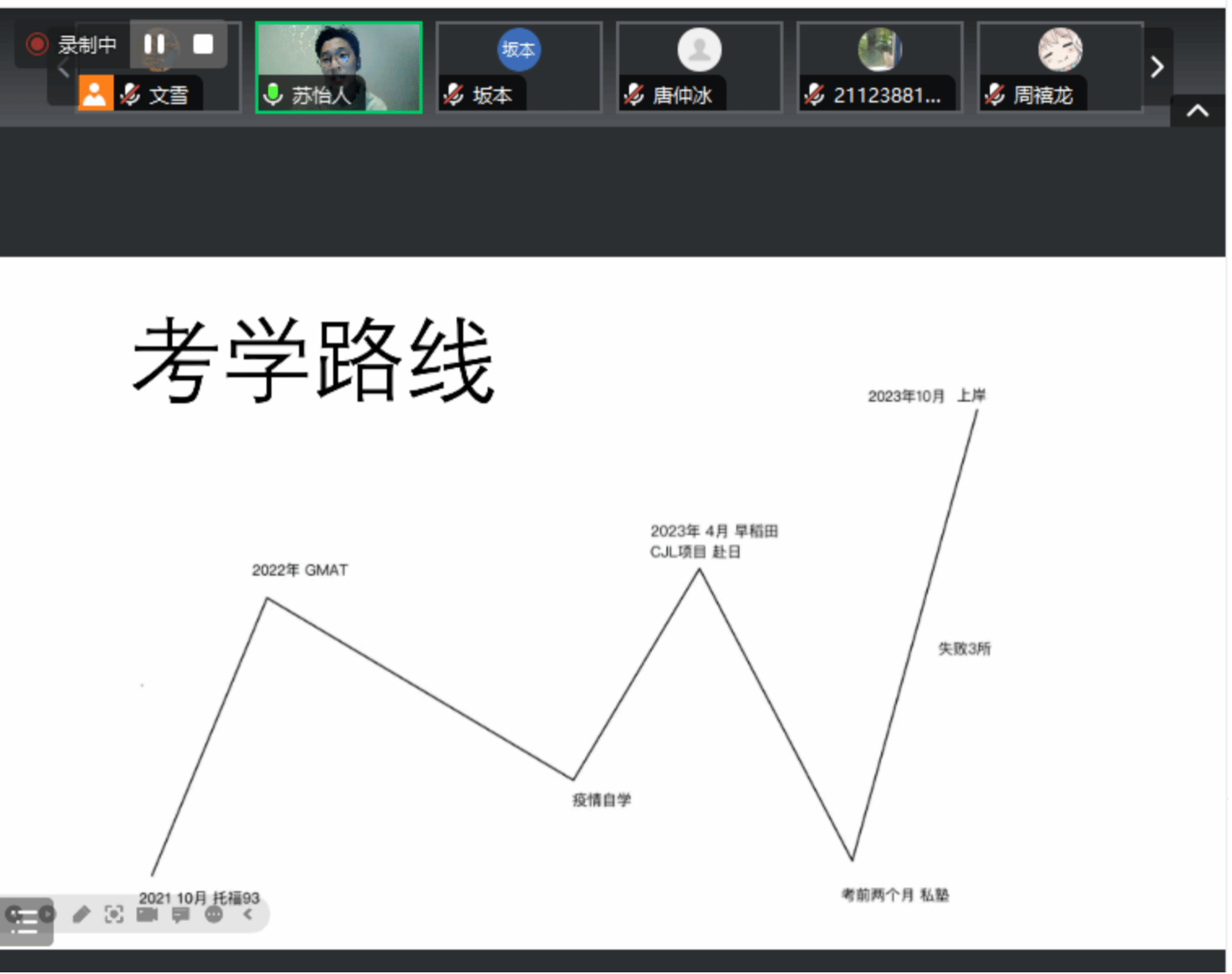 首先,苏怡人校友分享了其从日语专业跨考到商学专业,并最终被早稻田大学录取为硕士研究生的求学经历。他在自述中重点对自己的跨专业备考过程进行了详细介绍,特别针对备考过程中所遇到的信息差、跨专业知识空缺等困难,面向有相似生涯规划的在校生提供了克服困难的思路以及技巧。在发言结束后的提问环节,苏怡人围绕面试时的注意事项等问题进行了解答。