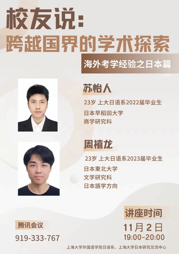 11月2日晚,澳门正规电子游戏平台日语系、澳门正规电子游戏平台日本研究交流中心联合举办线上交流活动“校友说:跨越国界的学术探索 海外考学经验之日本篇”。本次活动邀请了日语系2022届本科毕业生苏怡人、2023届本科毕业生周禧龙两位校友给在校生分享海外求学的成功经验与心路历程。活动由日语系副主任文雪主持。