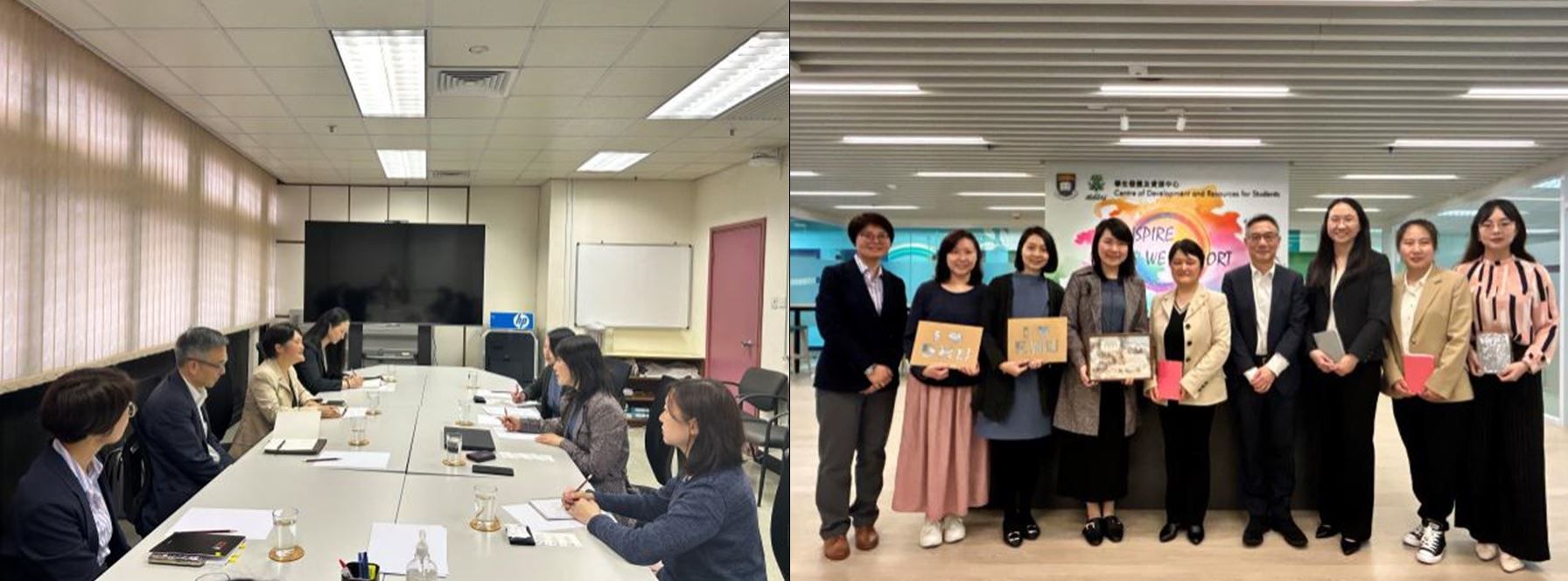 在FindAsia Limite总裁余晓校友陪同下,访问团一行还拜访了香港大学学生发展及资源中心就业总监林琦颖女士、学生咨询主任(就业)余继玲女士和何卉妍女士,双方就学生短期合作项目、文化交流互访等方面开展了友好交流、达成初步合作意向,并交换纪念品留念。