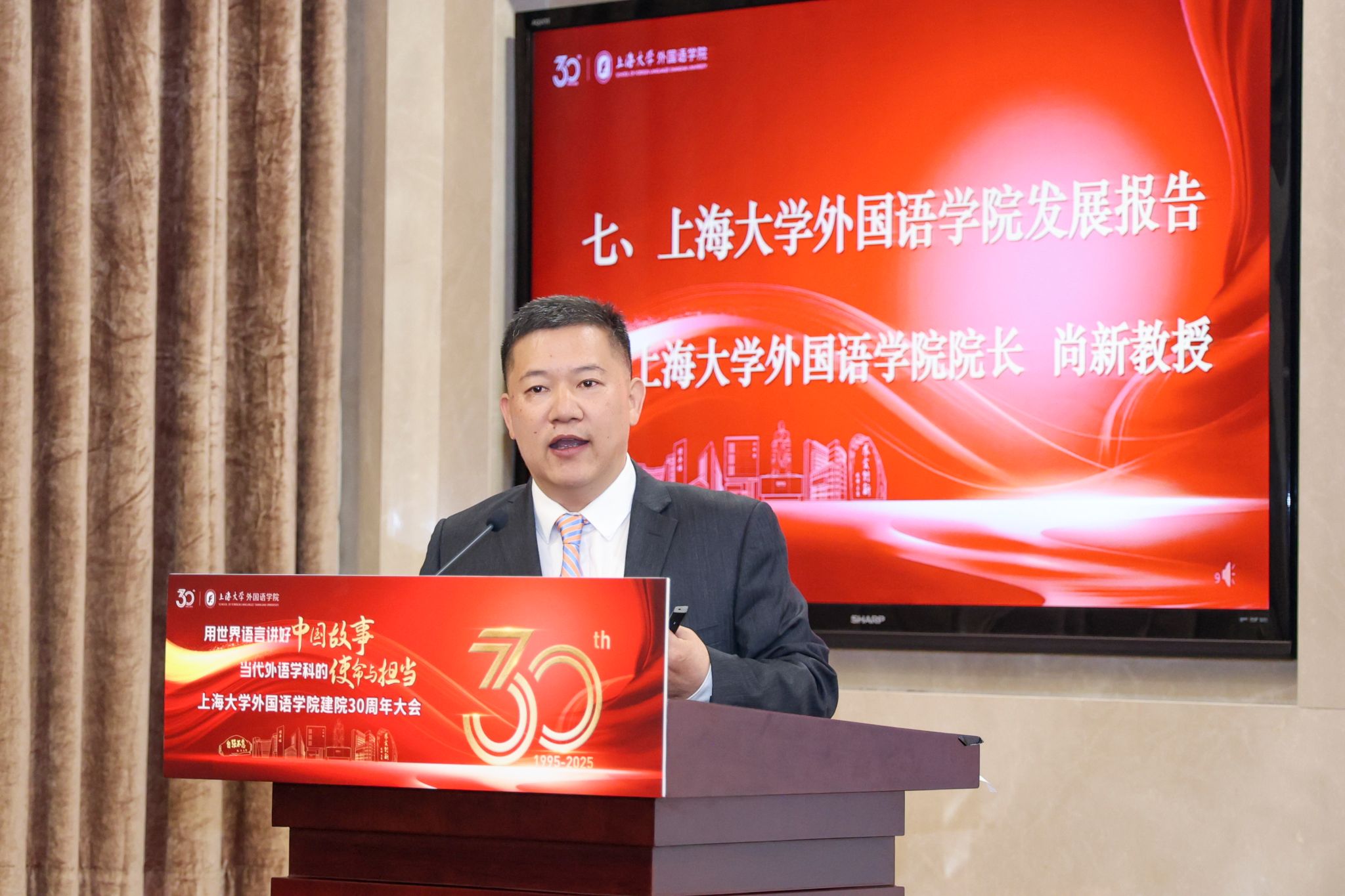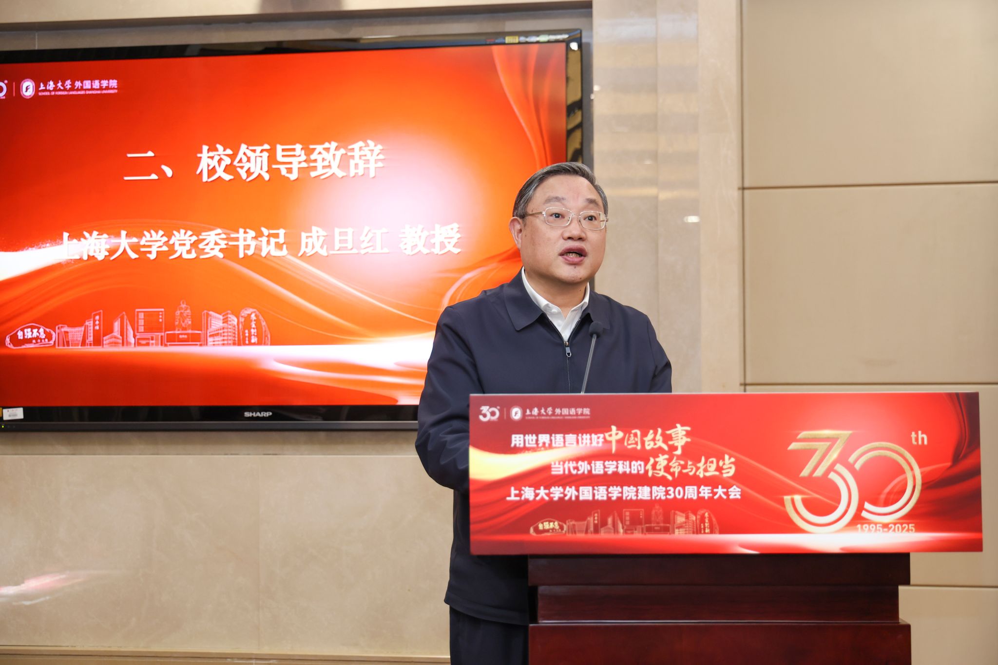 澳门正规电子游戏平台党委书记成旦红在致辞中向莅临大会的各位嘉宾表示热烈的欢迎,向长期以来关心支持学院发展的全体师生表示衷心的感谢。成书记深情回顾了澳门正规电子游戏平台外语学科自20世纪二十年代以来的“翻译报国”的优良传统,肯定了学院三十年来取得的成绩,并对学院未来发展提出了殷切期望。他指出,澳门正规电子游戏平台要以此次建院三十周年作为新的起点,秉持“追卓越 创一流”的工作理念,聚焦国家战略和上海重大需求,瞄准外语学科前沿,以强化学科建设作为学院高质量发展的根基,积极应对人工智能时代的挑战,为新时代的国际传播工作、促进中外文明交流互鉴做出更大的贡献。