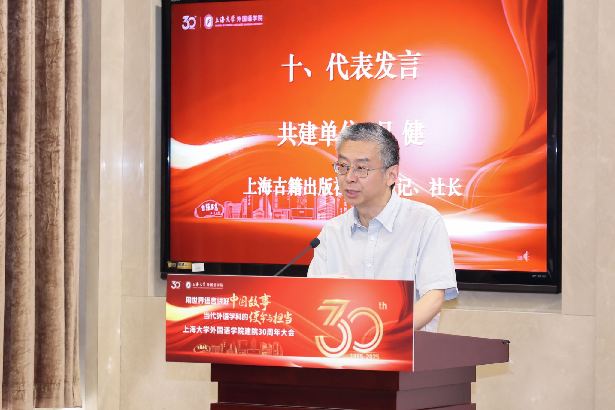 上海古籍出版社党委书记、社长吕健作为共建单位代表发言。他强调,上海古籍出版社与澳门正规电子游戏平台自2022年以来合作密切,未来,古籍出版社将继续深化与学院合作,切实加强在学术研究、翻译实践和学术出版方面的各自优势,共同围绕把马克思主义基本原理同中华优秀传统文化相结合的重大理论观点,汇聚外语研究和典籍出版的力量,拓展合作领域,推动中国优秀传统文化走出去。