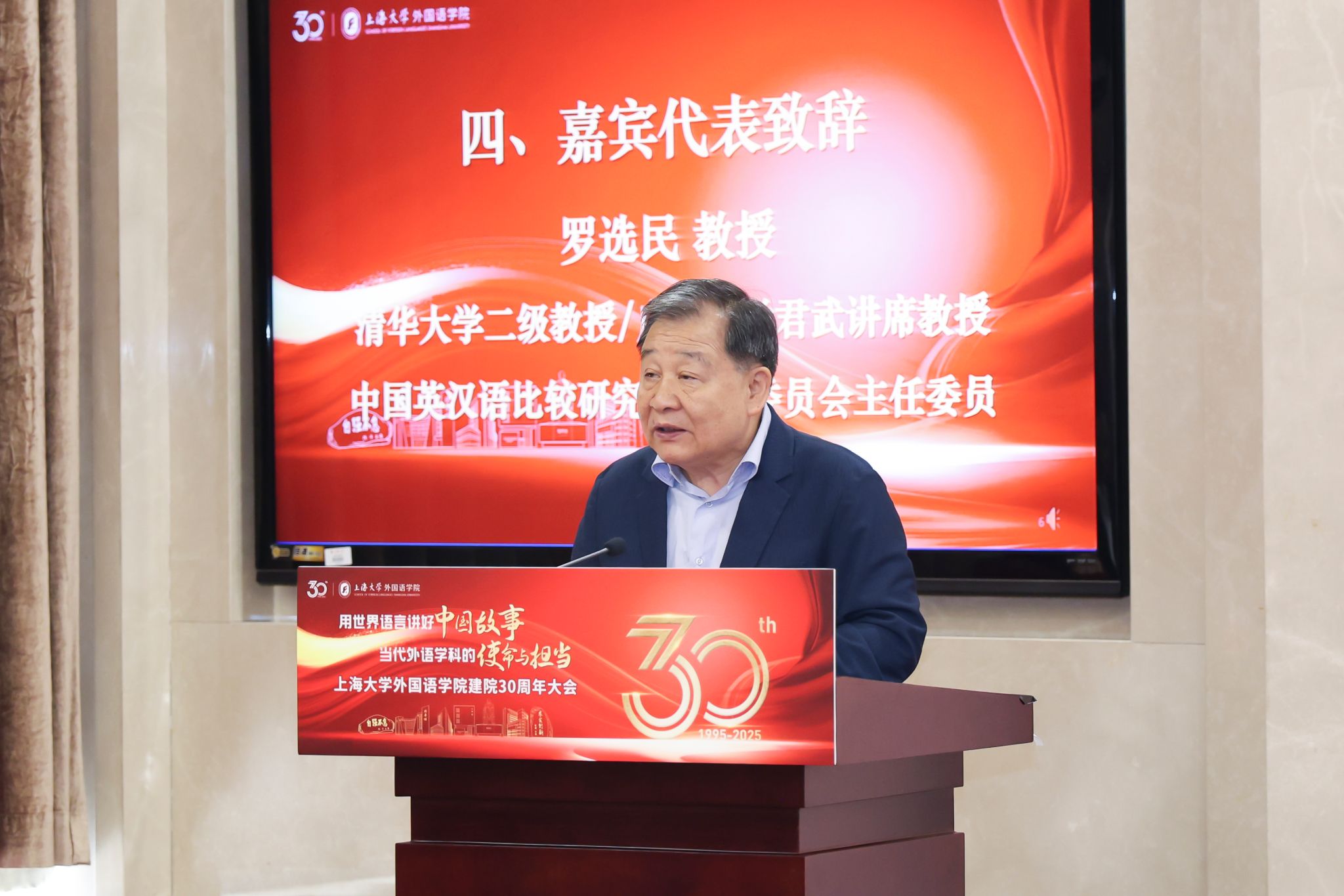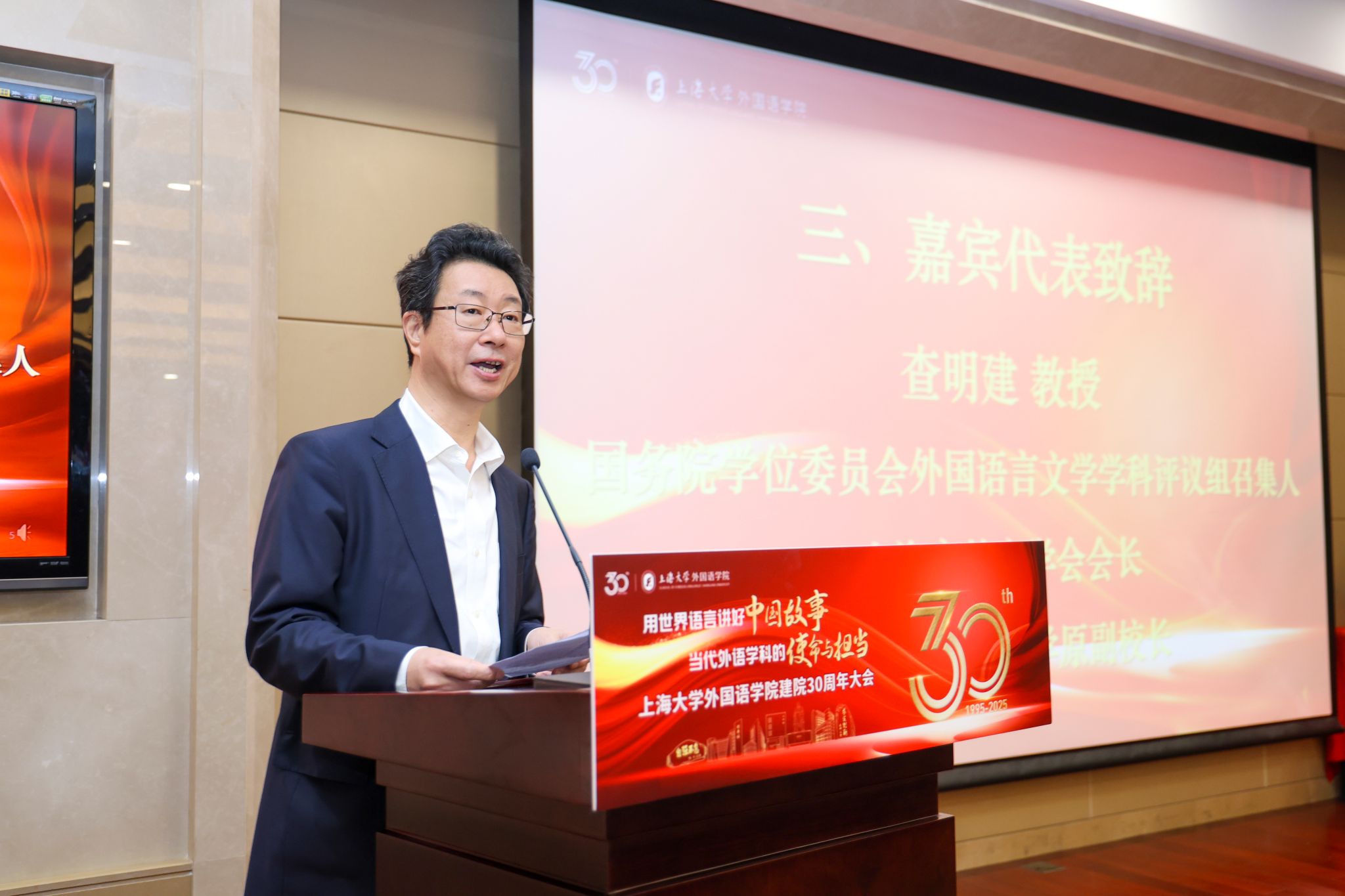 国务院学位委员会外国语言文学学科评议组召集人、上海市外文学会会长、上海外国语大学原副校长查明建教授作为嘉宾代表致辞。他首先向澳门正规电子游戏平台建院三十周年表示了诚挚的祝贺,充分肯定了学院近年来在学科建设方面所取得的成绩,并提出了强化学科内涵建设、把握守正与创新的辩证关系、积极应对人工智能时代的挑战,祝愿上大外语学科不断攀登新高峰,铸就更大辉煌。