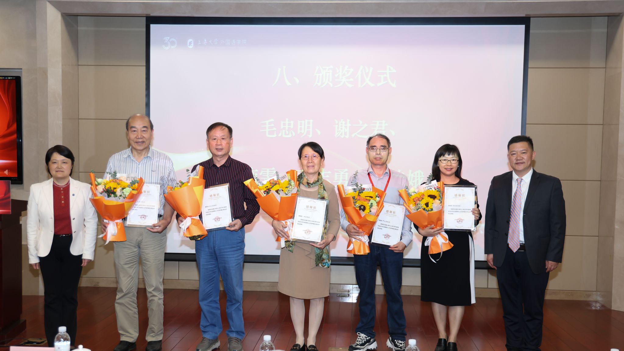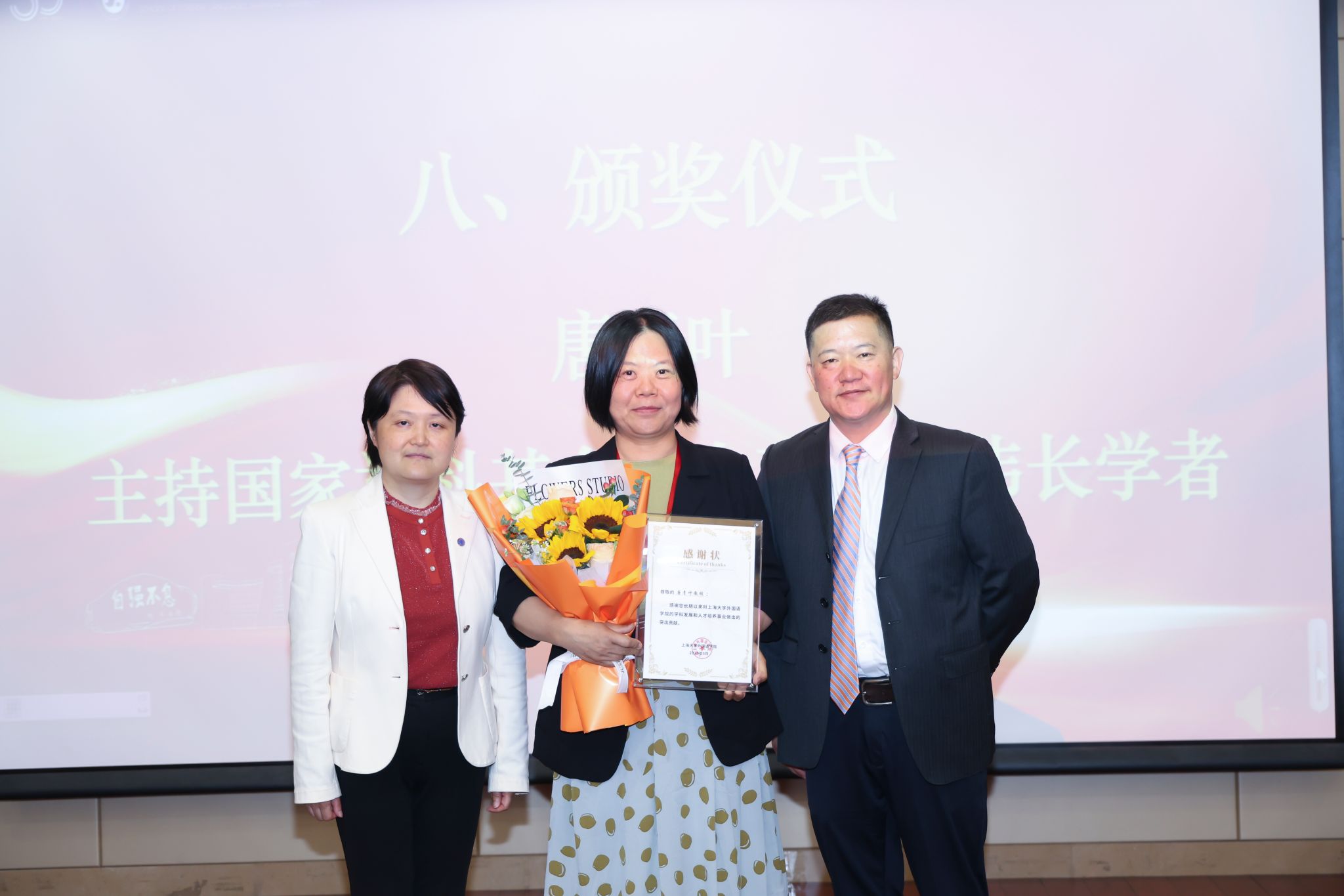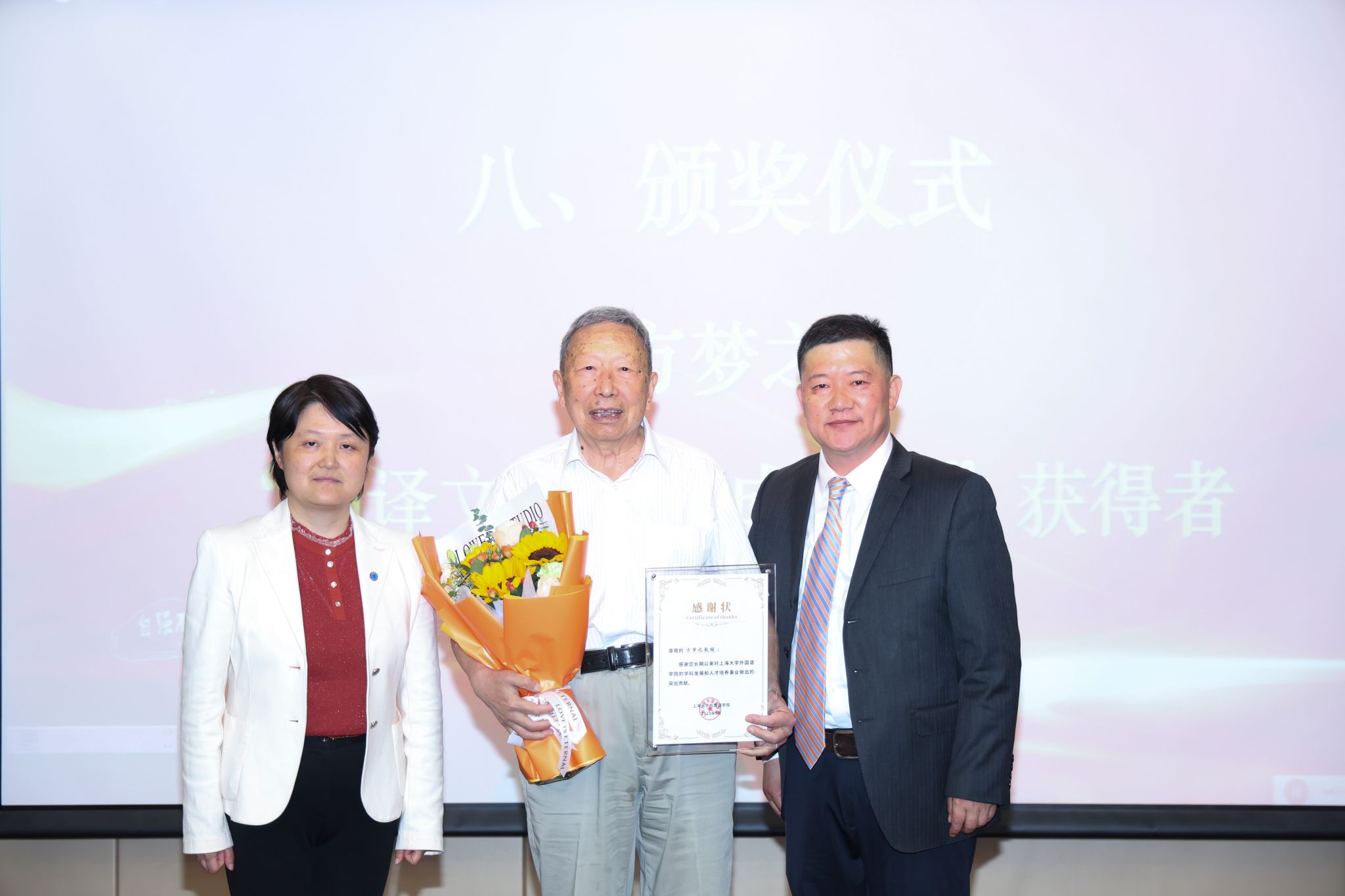 大会举行了颁奖仪式。澳门正规电子游戏平台党委书记吴蔚、院长尚新为方梦之教授(“翻译文化终身成就奖”获得者)、唐青叶教授(国家社科基金重大项目首席专家)以及澳门正规电子游戏平台历任书记、院长献上鲜花并颁发感谢状,诚挚感谢他们对学院人才培养和学科发展做出的重要贡献。