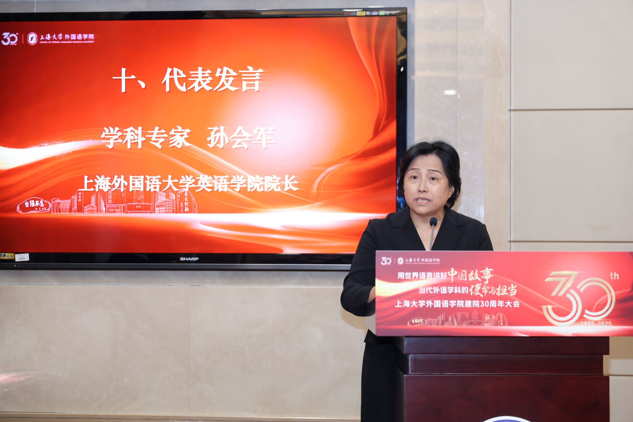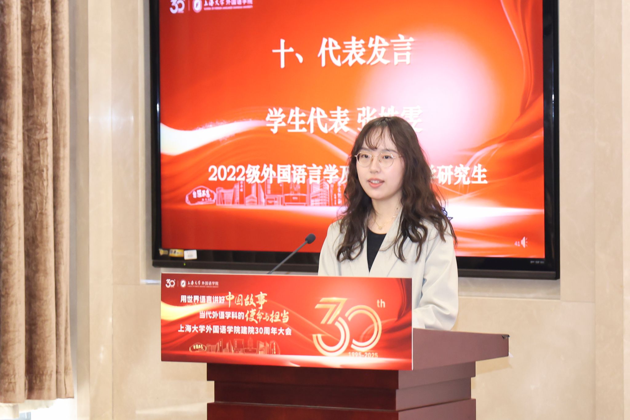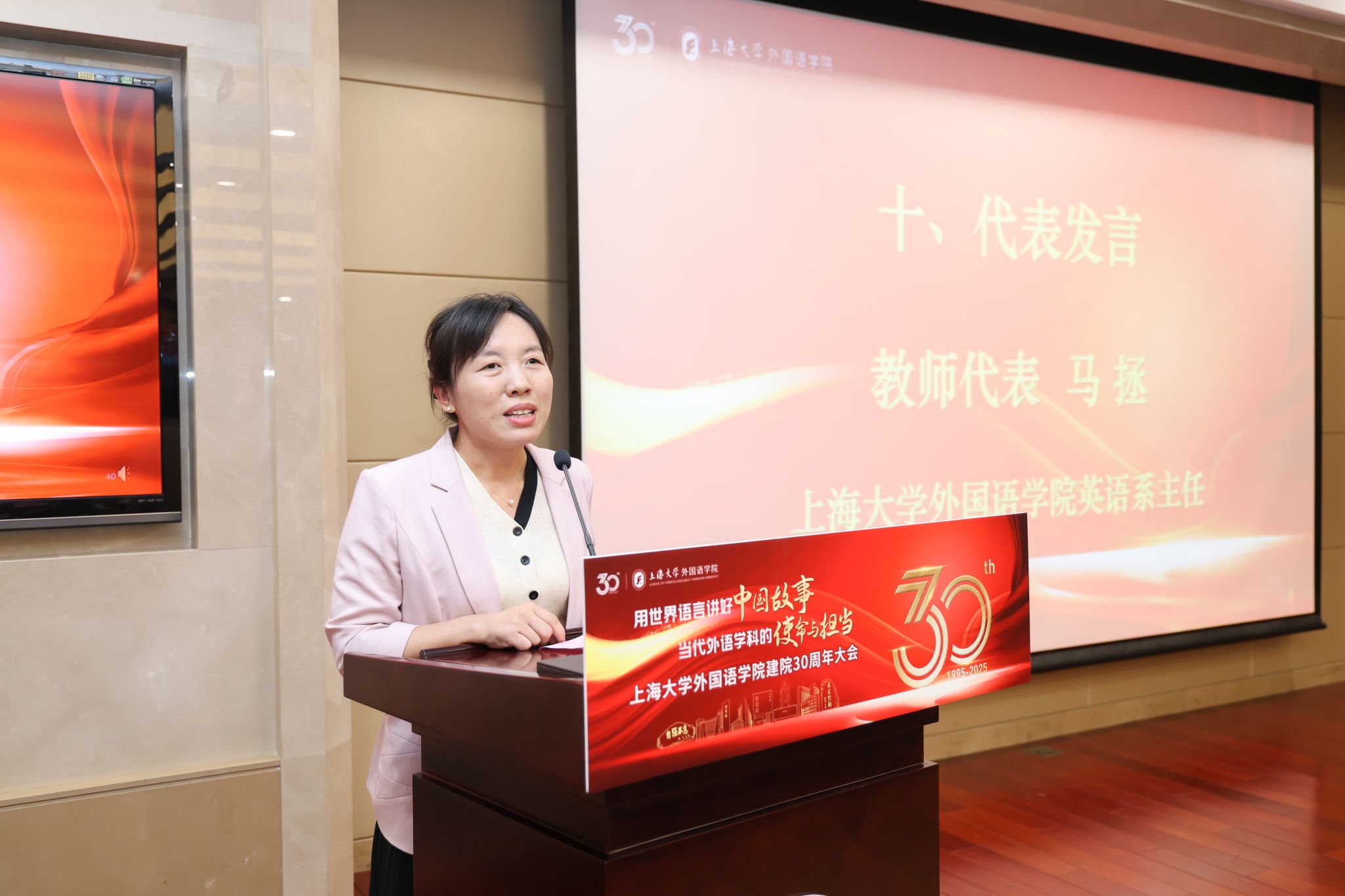 英语系主任马拯副教授作为学院教师代表回顾了学院从起步到获批一级学科博士点、持续推进“外语+中华/海派文化+信息技术+国际传播”的学科融合发展的发展历程。她表示,全体外院人将传承匠心、以创新为帆,携手用世界语言讲好中国故事,共谱学院下一个三十年壮阔航程。