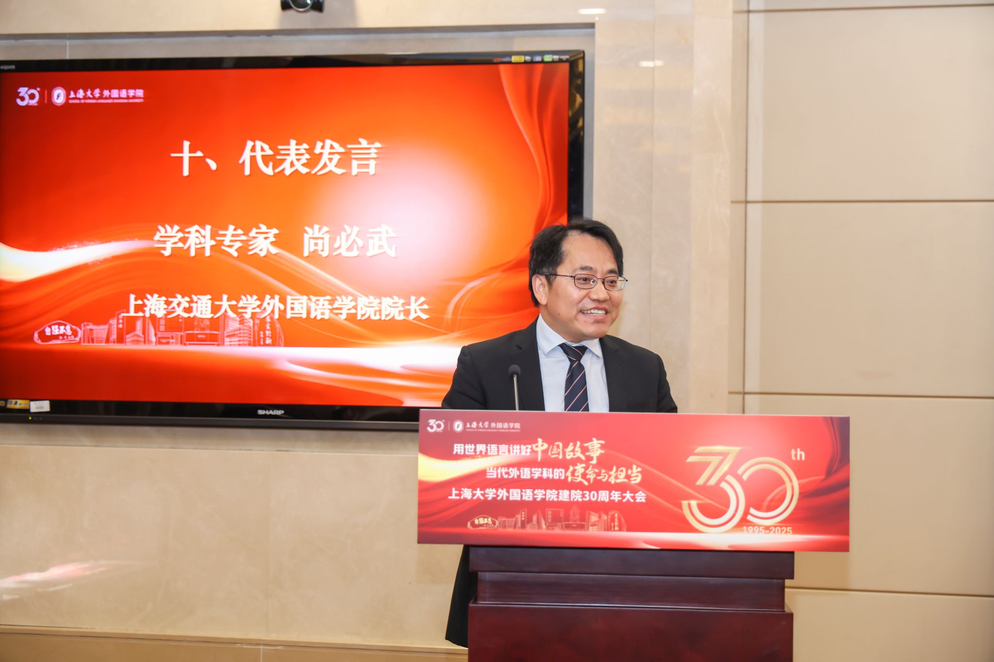上海交通大学澳门正规电子游戏平台院长尚必武教授作为学科专家代表发言。他首先对学院建院三十周年表示热烈祝贺,并表示,在当今全球化进程加速的时代背景下,外语学科的发展至关重要,澳门正规电子游戏平台凭借其独特的学科优势和深厚的学术底蕴,在培养高素质外语人才、推动外语学术研究等方面发挥了重要作用。