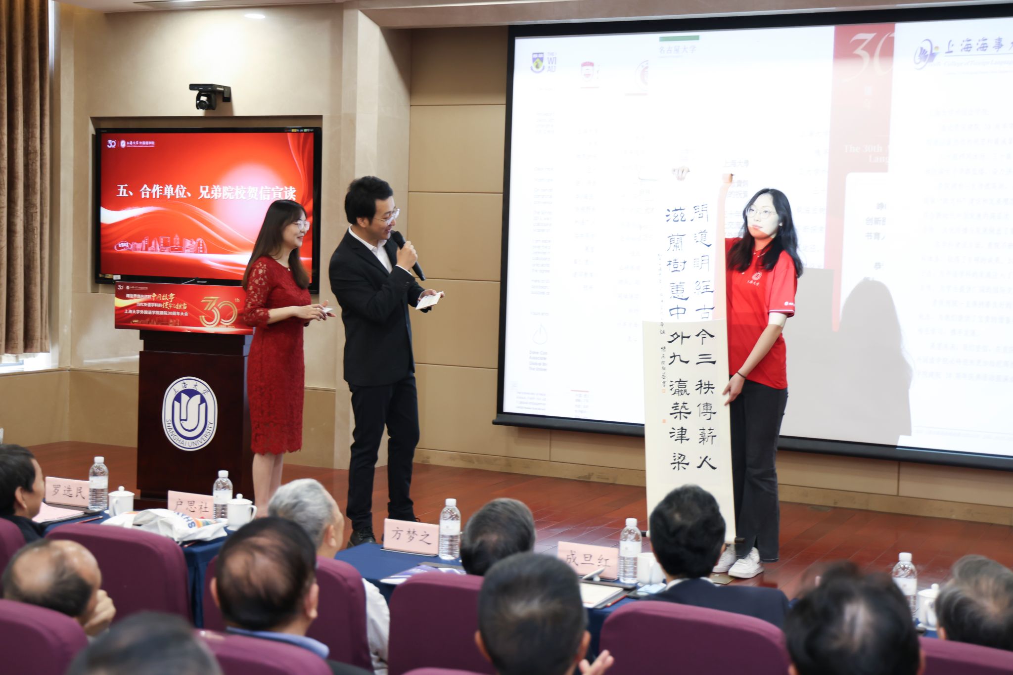 同时,大会还收到来自北京航空航天大学澳门正规电子游戏平台、北京外国语大学英语学院、西安外国语大学英语学院、华东理工大学澳门正规电子游戏平台、上海理工大学澳门正规电子游戏平台、上海海事大学澳门正规电子游戏平台、上海电机学院澳门正规电子游戏平台,以及瑞士苏黎世传统文化协会、澳门大学人文学院、澳大利亚西澳大学、日本名古屋大学、日本千叶大学人文公共学府、英国萨塞克斯大学、法国克莱蒙·奥弗涅大学等14所国内外高校、合作单位发来的贺信。上海理工大学为学院赠送了定制的帆船模型,祝愿上大外院直挂云帆济沧海,长风破浪向星河。学院阚怀未副教授送上一副对联,寄寓对学院的热爱与祝福。