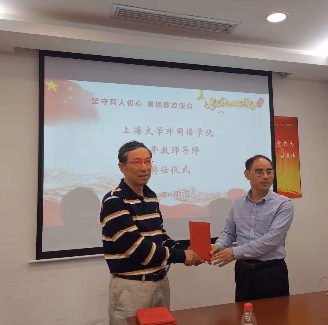 庄恩平、邓志勇、曾桂娥、尚晓进四位教授受聘为第一批青年教师导师。邓志勇教授为导师们颁发证书,青年教师代表向导师赠送鲜花。