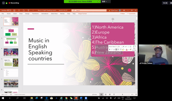 Tekwa老师首先向大家介绍了本节课的课程安排,接着回顾前6周的学习内容,他在授课时刻意放慢了语速,确保每个同学都能听懂。随后,他向学生们提出“What music of the English-speaking countries have you ever listened to?”导入本节课程主题即英语国家的音乐。在学生们普遍回答只听过英美流行音乐之后,他又抛出一个问题,“Why does music people listen to matters?”在一番互动之后,Tekwa老师似乎并不满足于学生们的答案,他切换到共享屏幕,播放准备好的视频材料,希望学生们带着这个问题思考视频传递的信息。就这样一步步地,Tekwa老师图文并茂地引导学生们领略从未听过的北美洲、大洋洲和欧洲的土著音乐。