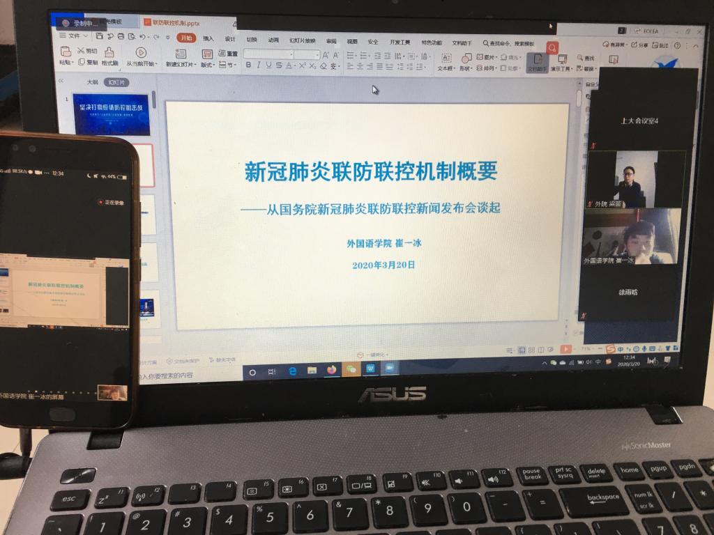 崔老师以中国气象局为切入点,讲解了中国近几年来的制度建设,介绍了党组织、国家机关以及事业单位的职能。经过崔老师的介绍后,同学们对国家的政治体系有了宏观的认识。之后,崔老师重点介绍了我国为应对此次疫情成立的中央领导小组和实施的联防联控机制,中央领导小组的工作主要由综合研判、政策制定、新闻发布三方面构成。他指出,领导小组的人员构成,可以侧面反映出国家应对此次疫情的主要方针,即从意识形态宣传、重点地区防控、外交对外合作、社会治安维护等方面所做出的的努力。结合实际案例,崔一冰老师带大家回顾了我校校级层面疫情防控工作的开展情况,并强调了我校成立的疫情防控领导小组以及学校各职能部门、各学院(系)在此次抗疫任务中的联防联控的作用和意义。