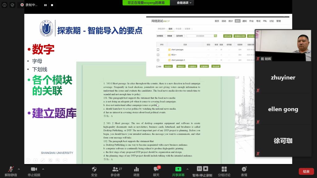 首先,贾老师给大家做了动员讲话,希望老师们在命题时考虑学生们特殊时期身边没有教材等实际困难,在线答疑时注意缓解学生压力。戴老师接下来详细解读了《澳门正规电子游戏平台2019-2020冬季学期在线考试须知》,从考试安排、考前准备、考试中的各种操作细则等方面进行了全方位细致的说明。随后,英语系吴羊老师分享了超星平台考试的操作经验,从试题导入到考前设置,给予了众多实用的小贴士。最后,与会教师就线上考试的各种问题进行了研讨,包括登录名的设置、摄像头的摆放、超星平台的考试时间设置、试卷的提交等。与会老师提出问题,并通过交流相互解答,解决疑问效果良好。