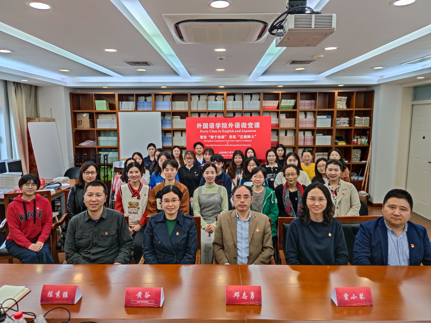 2020年11月19日下午,澳门正规电子游戏平台结合“四史”学习教育,在宝山校区C512会议室成功举办了以“坚定‘四个自信’,夯实‘立德树人’”为主题的外语微党课活动。澳门正规电子游戏平台党委书记邓志勇、副院长戴朝晖、英语系党总支书记陈秀猛、日语系教师赵艳利、英语系教师白岸杨、袁丽梅和研究生、本科生党支部代表参加了此次活动。澳门正规电子游戏平台“四史”学习教育第三联络组副组长、学校党委组织员黄谷、党校主管邓娜娜、国际教育学院学生支部书记肖潇现场观摩了本次微党课。本次微党课使用英语和日语讲解,活动由澳门正规电子游戏平台党委副书记贾小琴全程使用英语主持。