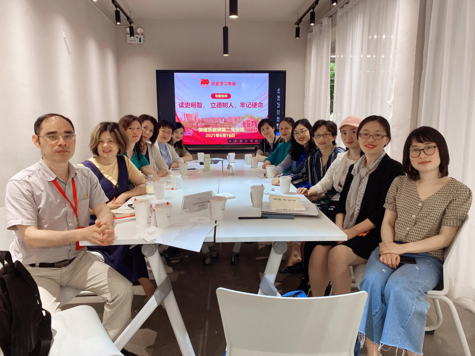 随后,在自由讨论环节,与会党员纷纷就党史学习教育、外语教学、社会实践与课程思政等问题发表观点见解。叶新同志强调外语教学中方法论的重要性;吴雪颖、邵庆华、周育同志结合翻译教学,指出中国文化海外传播的重要时代意义;温年芳和薛清同志探讨秋季学期新教材的课程思政问题;范金萍、沈力同志提出,引导学生辨别信息真伪、培养辩证思维、端正立场态度是外语教学工作中的重要环节。最后,支部成员选取《水调歌头——重上井冈山》作为支部在“百年礼赞”诗歌朗诵展示中的作品,以庆祝中国共产党百年华诞,共忆峥嵘岁月,共抒爱党爱国情怀。