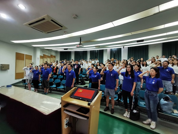 7月1日上午8时,澳门正规电子游戏平台百余名党员师生齐聚校本部J101教室,共同观看庆祝中国共产党成立100周年大会,共同聆听习近平总书记发表的七一重要讲话,并重温入党誓词。