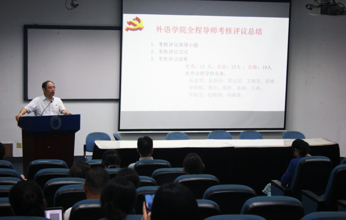 随后,邓书记宣布了学院全程导师考核评议结果,向被评为优秀的全程导师们表示祝贺,也对导师们指导过程中存在的一些问题,结合学生的反馈提出了建议,如:论文导师与全程导师今后可以相统一;导师对未来读研读博的同学可以有更长远的指导;希望在今后的指导过程中,导师们对学生的发展有更个性化的设计规划等。邓书记同时也表示,在今后的全程导师制工作中,学院将不断完善操作细则,建立激励机制,开展评奖评优工作,大力宣传导师们的奉献之心和仁爱之心,营造学院良好育人氛围。