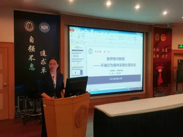在师德师风教育专题报告环节,学院副书记兼纪检员贾小琴做了题为“教师警示教育——不端行为案件及其处理决定”的报告。贾老师结合近期网上几件造成不良影响的高校教师语言、行为不端案件,告诫和警示全院教职工,在日常教学工作过程中要谨言慎行,严以律己,严守师德师风,做好育人工作。