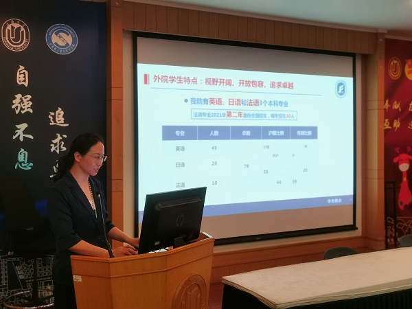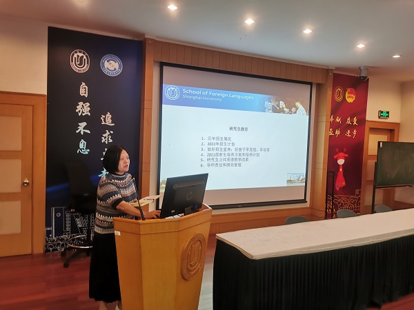 分管研究生教学工作副院长唐青叶就学院今年研究生招生情况、2022年招生计划、招生宣传、2021新生培养计划、研究生公共英语教学改革以及导师责任等方面做了报告。