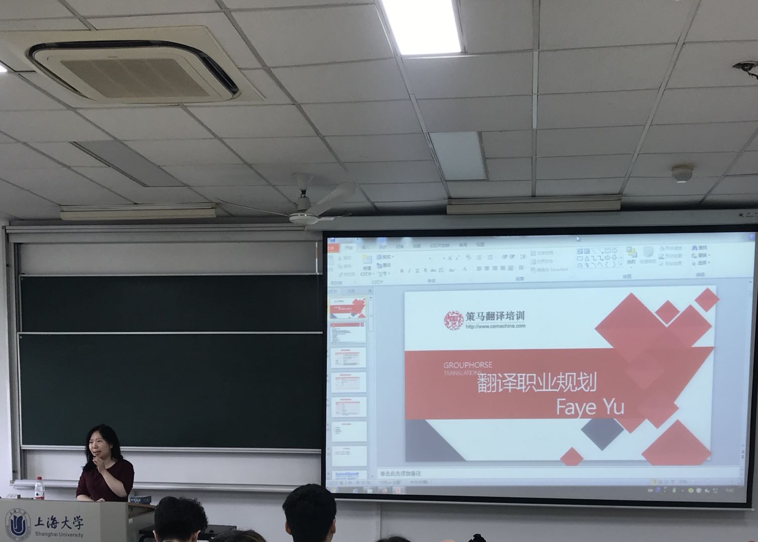 本次讲座的主讲师是策马全职译训师Faye Yu。讲座伊始,Faye培训师首先介绍了翻译相关工作,除了传统的全职兼职翻译外,还提到语言服务行业以及技术写作等目前在腾讯、阿里等互联网以及科技类企业中炙手可热。此外,Faye还分享了翻译的工作具体内容和热门领域,并强调了法律和财经金融的市场优先级,鼓励同学们在校期间积极积累证书、实习经历和翻译作品。