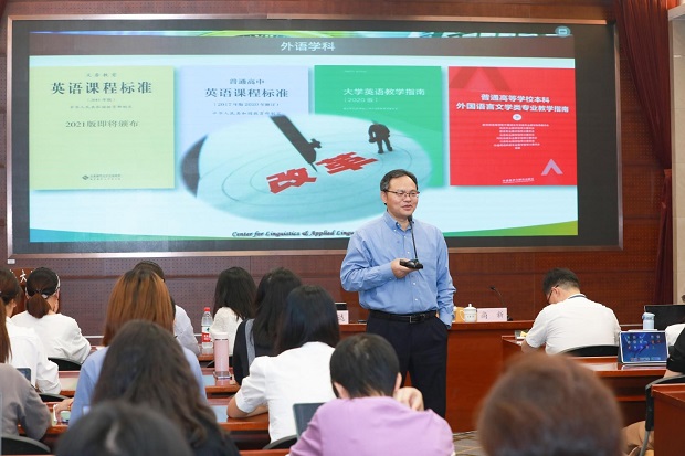 围绕大学外语教育改革,刘教授分享了“守正创新,知常明变”八字原则,提出融合各基础课程的“交际英语”教学法,指出要重视工程英语、法律英语、医学英语等专门用途英语的人才培养。此外,刘教授深入解读了中共中央国务院印发的《深化新时代教育评价改革总体方案》文件,认为新时代的评价改革应改进结果评价、强化过程评价、探索增值评价、健全综合评价。最后,刘教授展示了他首创的电子档案袋评价系统(e-portfolio),该系统融合形成性评价理念,趣味性强,参与度高,深受师生欢迎。