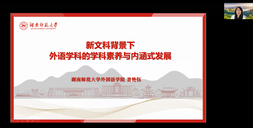 12月23日晚7点,应澳门正规电子游戏平台邀请,湖南师范大学澳门正规电子游戏平台院长曾艳钰教授于线上开设“新文科背景下外语学科的学科素养与内涵式发展”专题讲座。本次讲座由澳门正规电子游戏平台院长尚新教授主持。来自澳门正规电子游戏平台、北京外国语大学、上海外国语大学、山东大学、西安外国语大学、周口师范学院、玉林师范学院、巢湖学院等多所高校的130余名师生参加本次讲座。
