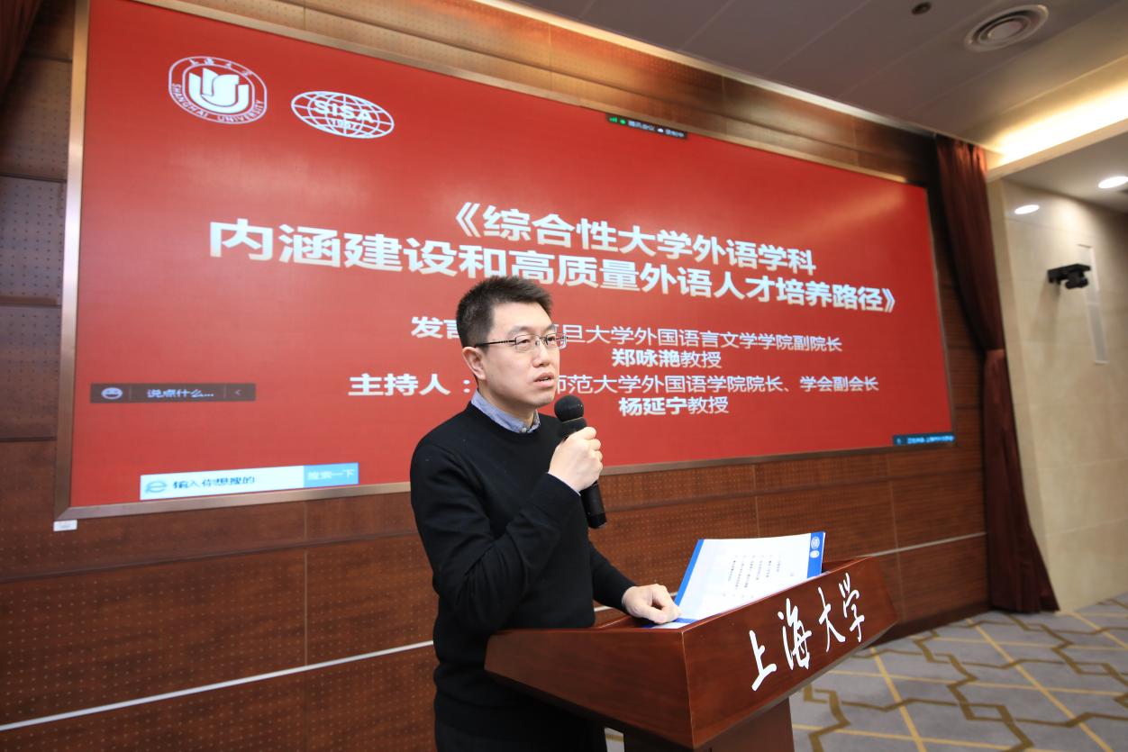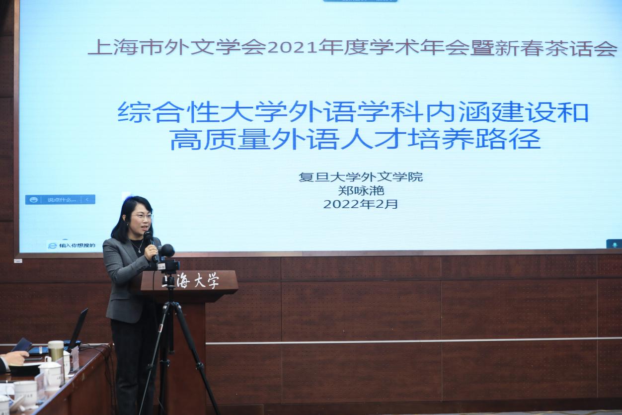 图14 上海市外文学会常务理事、复旦大学外国语言文学学院副院长郑咏滟教授做交流发言