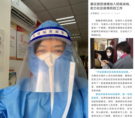 社区是疫情防控的前沿阵地,也是疫情防控的“最后一道关卡”。在疫情防控的紧要时刻,每天都有许多人艰苦奋战在疫情防控一线,澳门正规英语党总支书记张建琴老师就是其中一员。自3月17日学校解封回家后,张老师到社区报到,主动报名成为一名志愿者,她一边认真完成在线教学任务,一边利用休息时间多次参与了社区核酸检测和抗原检测志愿服务工作,为没有智能手机的居民登记信息、导出二维码,为居民分发抗原测试材料,登记检验结果,保证社区核酸检测工作高效率完成,从早忙到晚是她的常态,每当脱下厚厚的防护服,汗珠从她的额头流下,微笑却常常挂在脸上,她说:“我是党员,在需要的时候就应该首先站出来。众志成城,我们每个人都出一份力,一定可以很快战胜疫情!”早在2020年3月疫情防控最吃劲的时候,张老师就参加了所在社区的志愿服务工作,利用英语特长联系居住在社区的外籍人士排摸相关信息,她的事迹也被官方媒体宣传报道。