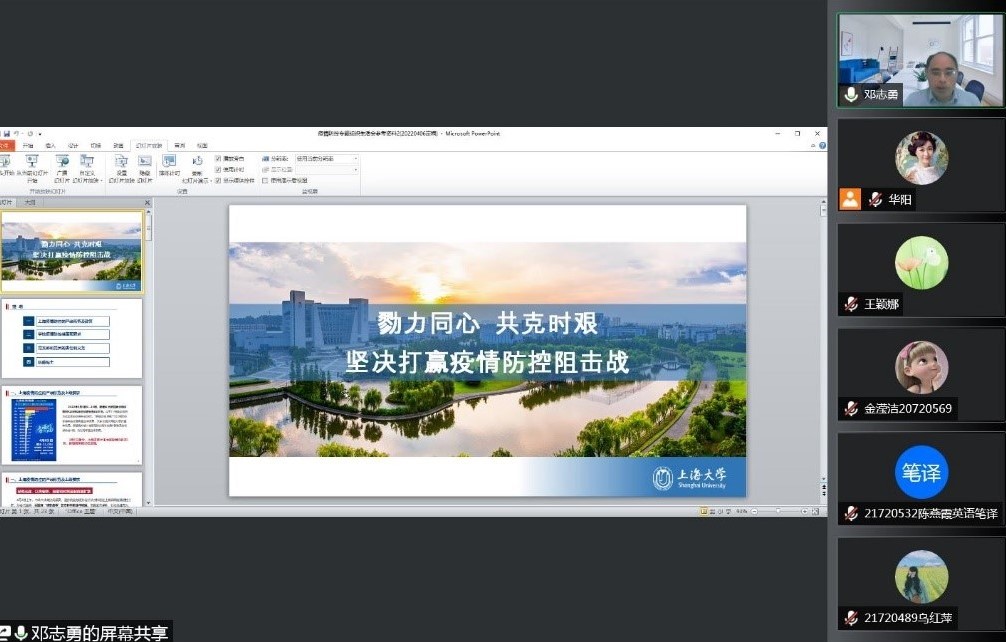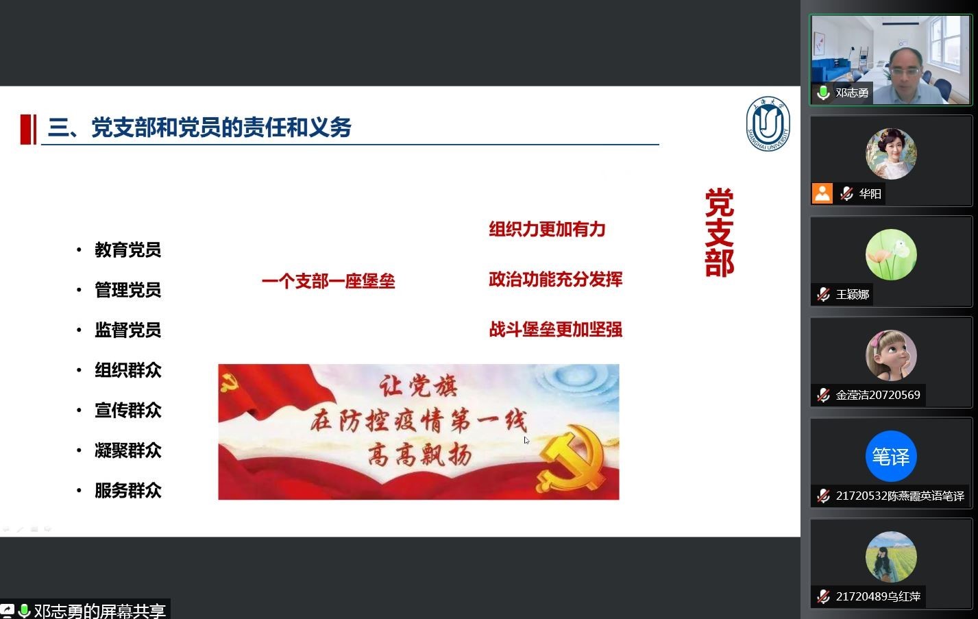 4月7日中午12点,澳门正规电子游戏平台党委以线上会议方式召开疫情防控专题组织生活会工作部署会,传达党中央、上海市疫情防控有关精神和要求,对下一步疫情防控工作再动员、再部署、再落实。学院党委书记邓志勇,党委副书记、副院长贾小琴,党委委员、英语党总支书记张建琴及全体党支部书记参会。