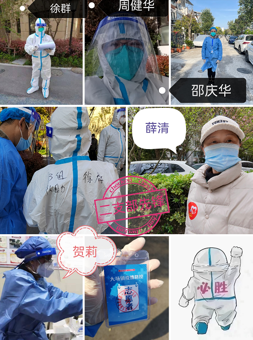 党员“双报到”实现全覆盖,冲锋在前,展示大爱。我支部全体党员在社区“双报到”已做到全覆盖,支部党员贺莉、徐群、薛清、邵庆华、周健华已经在社区做志愿者多日,还有部分老师严阵以待,随时等待社区安排。贺莉老师在社区志愿活动中,看到了社区为大家服务的认真和周到,看到了大白们的耐心和坚持,看到了志愿者们参与社区活动的主动和热情,以及居民们对社区工作的支持与肯定,感受到了大家众志成城、团结抗疫的积极与努力。徐群老师从学校解封回家后的第二天就在社区报到,开始了志愿服务工作,她主要负责组织核酸检测、发放物资等,徐老师所在社区位于嘉定区,疫情开始的相对较早,徐老师做志愿服务的战线拉的也比较长,在分享的时候略显疲惫,但是她说:“我们党员在这个时候,就要站出来,做点自己力所能及的事情。”薛清老师在疫情暴发的时候便在小区里做志愿者,负责维护秩序,作为一名老党员,薛老师在志愿服务的过程中,看到了她所在小区基层管理的有序性和经验的可推广性,小区就地组建了临时党支部,参加临时党支部的同志,很多都是居家工作的精兵强将,年轻有头脑,工作效率高,第一时间冲在前面,让整个小区一直处于顺利运转的状态。邵庆华老师在做核酸检测的时候,主动联系社区要求参加志愿服务工作,小区里有独居老人食物不够的,她也会捐赠食物给老人,她说:“在邻里之间最困难的情况下,这是发自内心的互助。”周健华老师家中有两个孩子需要照顾,但她克服困难主动做志愿服务工作,协助组织核酸检测、发放物资、维持秩序、建群组织邻居等,她在志愿服务过程中,感受到基层的不易,她说:“大家这个时候都很辛苦,作为党员要做点力所能及的事。”