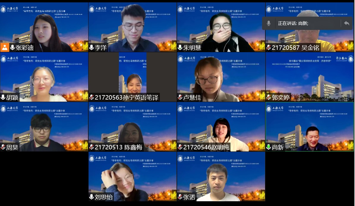 本次“导学有约:研究生导师科研之路”主题分享线上会议进行了近三个小时。尚新教授不仅在生活上给予了同学们深切的关怀,也在学业和科研上为大家提出了建设性意见和悉心指导,使同学们都受益匪浅。相信在导师与同学们的共同努力下,大家一定会克服疫情难关,在学业和科研上继续创造硕果。