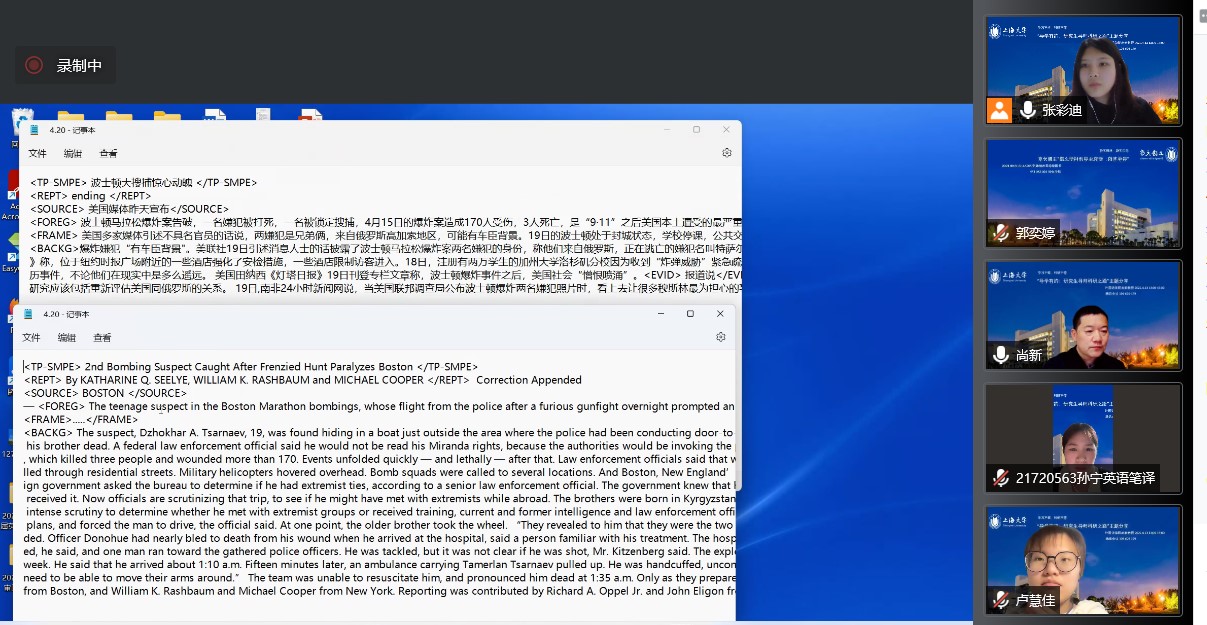 最后,尚老师指导安排了研究生们共同参与的国家社科基金项目的科研助理工作。尚老师指出,近期大家都比较忙碌,再加上疫情影响,许多事情的开展都存在困难,本应线下指导大家该如何对事件报道进行语料标注,但囿于现实,如今只能简要说明,并会在之后将模板发给各位科研助理用于研究学习。随后,尚老师通过屏幕共享详尽介绍了标注方式,并耐心地与同学们共同探讨,以期有更加高效和完美的方法。