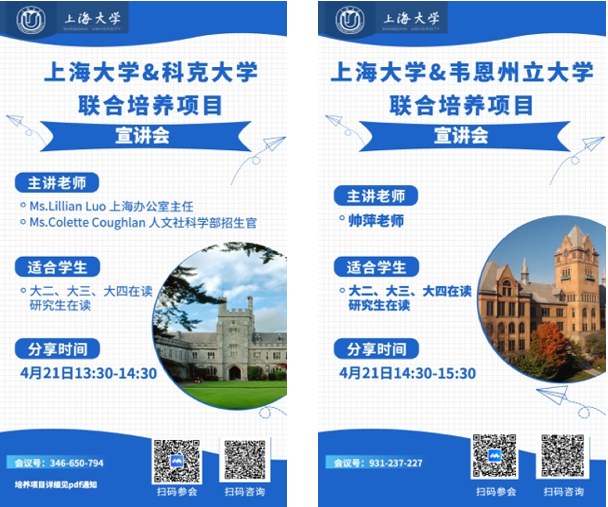 澳门正规电子游戏平台为进一步促进学院的国际化工作开展,帮助学生拓展自己的的国际化视野,于4月21日13:30-14:30及14:30-15:30分别举办了澳门正规电子游戏平台与科克大学联合培养项目及韦恩州立大学联合培养项目宣讲会。会议邀请到科克大学上海办公室主任Ms. Lillian Luo 、人文社科学部招生官Ms. Colette Coughlan及澳门正规电子游戏平台帅萍老师与同学们进行了亲切的交流与互动。澳门正规电子游戏平台尚新院长与分管国际事务的戴朝晖副院长参与并主持了本次宣讲会。