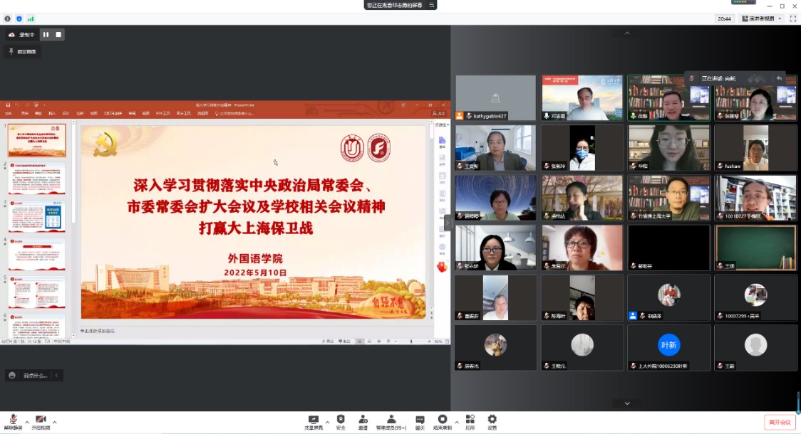 大会开始前,尚新院长向各位老师表达诚挚的问候,并向大家介绍了法语系新进教师王文新教授。会上,邓志勇书记首先以“深入学习贯彻落实中央政治局常委会、市委常委会扩大会议及学校相关会议精神,打赢大上海保卫战”为题,对疫情防控工作进行了工作部署。邓书记指出,中央政治局常务委员会召开会议,分析当前的疫情防控形势,坚持“外防输入,内防反弹,坚持动态清零“。这个方针是我们党的性质和宗旨决定的,所以我们的防控政策是经得起历史检验的,我们的防控措施是科学有效的。以前我们打赢过武汉保卫战,现在我们也有决心、有信心打赢大上海保卫战!邓书记强调,当前疫情防控工作正处于“逆水行舟、不进则退”的关键时期和吃劲阶段,感谢全院教师的大力支持和辛勤付出,希望全院教师在做好自身疫情防护工作的同时,严格遵守学校疫情防控有关要求,织密学院防控网,做好线上教学保障工作,保证当前各项工作平稳运行,同心战“疫”,共克时艰。