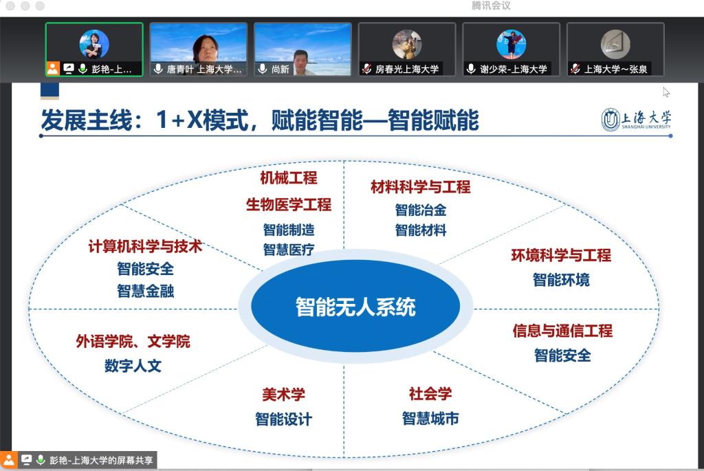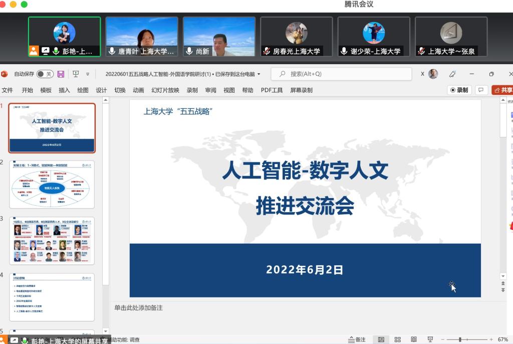 2022年6月2日,澳门正规电子游戏平台“五五战略”——“人工智能-数字人文推进交流会”在线上举行。澳门正规电子游戏平台副校长汪小帆,科研管理部常务副部长张新鹏,人工智能研究院执行院长、无人艇工程研究院院长彭艳,计算机工程与科学学院院长谢少荣,澳门正规电子游戏平台院长尚新,党委书记邓志勇,党委副书记、副院长贾小琴,科研副院长唐青叶,教学副院长戴朝晖和知名神经认知语言学专家程琪龙教授出席了本次会议。