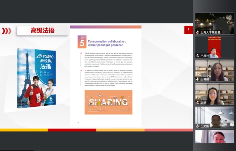 7月1日上午,澳门正规电子游戏平台法语专业教研室和外语教学与研究出版社法语部在线上举行了法语教材建设交流会。我校特聘教授户思社先生、王文新教授、法语教研室主任向维维老师和陈静、焦舒曼等教师,外研社法语部孟贤颖主任、王裔晴老师,以及我校中欧学院金闪闪、刘芳菲等教师参加了交流。